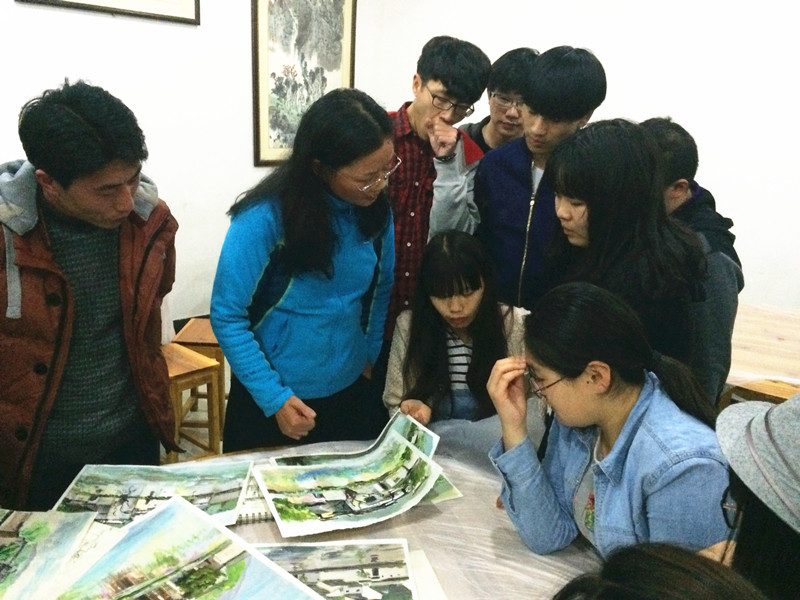 宏村素有“中国画里乡村”之称,保存了古徽州的气韵,民风纯朴,人与自然和谐,特别是宏村南湖晨曦缭绕的云雾与古徽派建筑相映成趣,有世外桃源的意境。同学们在此纷纷选景选点,以各自的情怀来展现徽派建筑和皖南风景的秀美,在享受着大自然和人文景观带来的艺术气息的同时,也在探求自己的绘画语言,专业老师更是一边示范一边讲解,还每天利用晚上的集中时间进行作业评点,同学们受益匪浅。