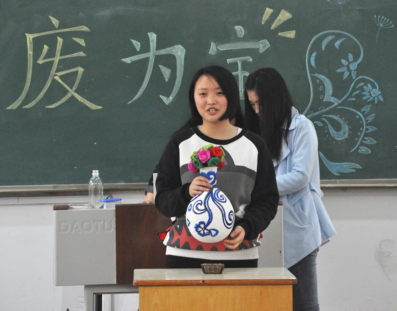 4月2日中午12点30分在A楼底楼的一个教室举行了变废为宝的创意活动。变废为宝要求学生自己动手,利用生活中的废弃物制作有用的装饰品或其它手工艺品。活动共展示了十三组作品,选手对作品进行阐述说明。由在场的大众评审选出他们心中最满意的三个作品进行投票。13理的作品最为用心,也展示了相应的制作过程的视频,用废弃的卡纸制作了精巧的莲花装饰品,获得了本次活动的第一名。