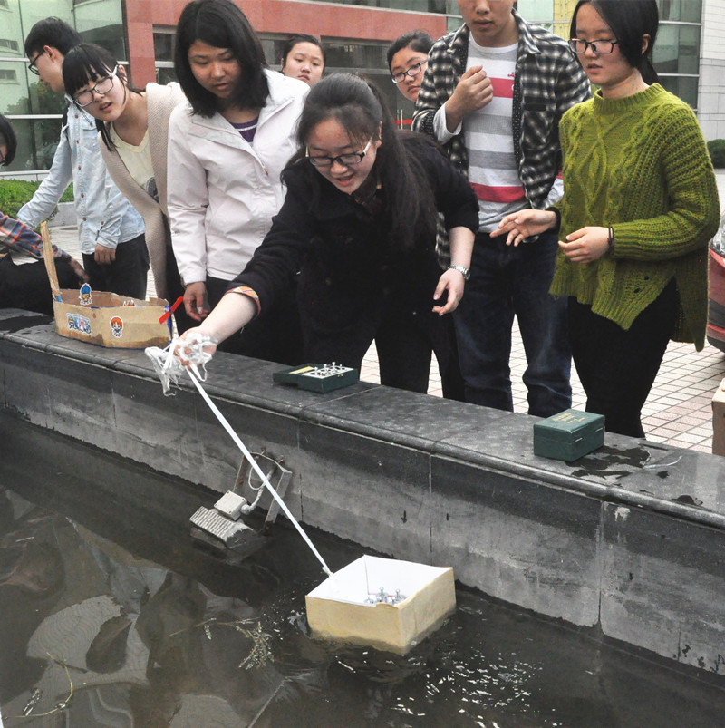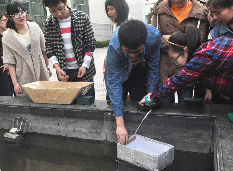 3月31日下午第三课后在综合楼前的池塘举办了乘重船比赛。本次比赛要求船体材料只能用纸张不能选用其他材料,粘合剂也只能用胶水或502,不能使用胶带,禁止选用防水材料,同时规定船体重量小于500克。比赛时,在船上叠加砝码,坚持到最后的则为赢家。乘重船比赛不仅考验了同学们的动手能力,同时船身模型的设计,比赛时砝码的放置都是门技术。最后理13班的同学赢得了比赛。