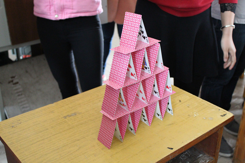 与心灵手巧活动同时进行的是擎天一柱活动。利用一组相同数量的纸牌搭出自己能达到的最高高度。五组同学各自想出办法,让自己的“塔”更稳更高,但这并不是易事,细心和耐心两者缺一不可。理11班乘胜追击,以34厘米的成绩险胜小教11的塔牌,笑到了最后。