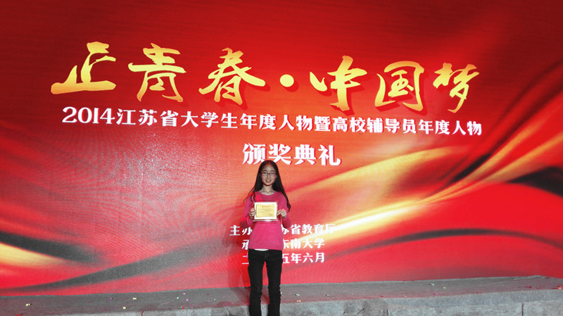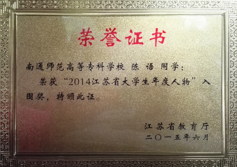 6月2日由江苏省教育厅主办的“2014江苏省大学生年度人物暨高校辅导员年度人物”颁奖典礼在东南大学落下帷幕,我校音乐系艺术10班级的陈语同学凭借突出的专业成绩,经过层层推选获得年度人物入围奖。此奖项是我校进入高校以来获得的第一个个人奖,充分展示了我校学生的综合实力。
