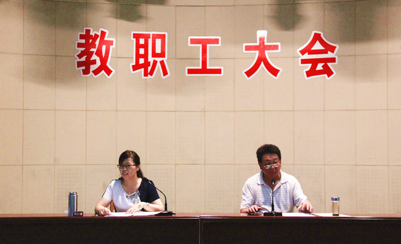 7月10日下午,我校在南通校区召开学期结束工作教职工大会。大会由党委书记丁兆雄同志主持。校长朱月萍总结了本学期学校在思想政治教育、体制机制建设、学科专业建设、人才队伍建设、学术科研建设、培训基地建设、学生管理工作、招生就业工作、后勤保障工作、校园文化建设、和谐校园建设等十一个方面取得的进展和成绩,并对广大教职工的暑期工作和生活提出三点希望:一是希望党员干部认真参加“三严三实”专题教育;二是希望教职工继续践行社会主义核心价值观;三是希望有暑期工作任务的同志保证各项工作进度。