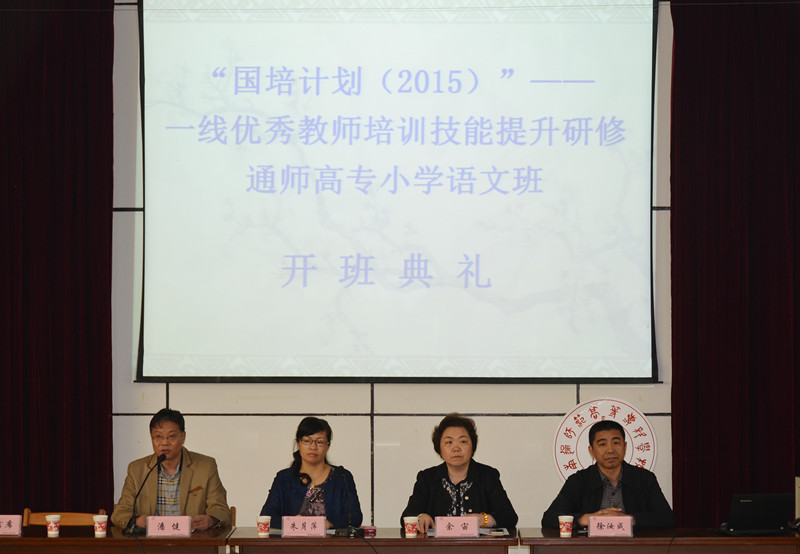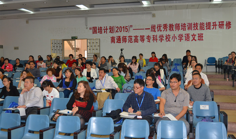 2015年10月13日上午,“国培计划(2015)”——一线优秀教师培训技能提升研修南通师范高等专科学校小学语文(骨干教师)班和“国培计划(2015)”——一线优秀教师培训技能提升研修南通师范高等专科学校小学语文(优秀教研员)班在我校同时开班,上午8:30在学校图书馆二楼报告厅举行开班典礼,来自全国16个省、市、自治区(湖南、江苏、青海、山西、重庆、山东、广西、甘肃、陕西、江西、上海、福建、安徽、河北、内蒙古、贵州)的100位小学语文骨干教师汇聚我校,参加此次培训活动,南通师范高等专科学校校长朱月萍教授,南通市教育局副调研员、人事与师资处余宙处长出席开班典礼,南通师范高等专科学校副校长潘健教授主持开班典礼。