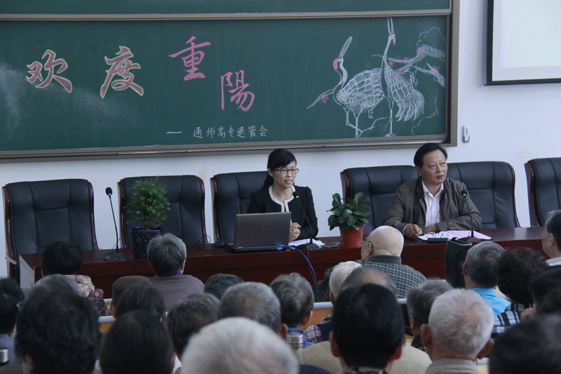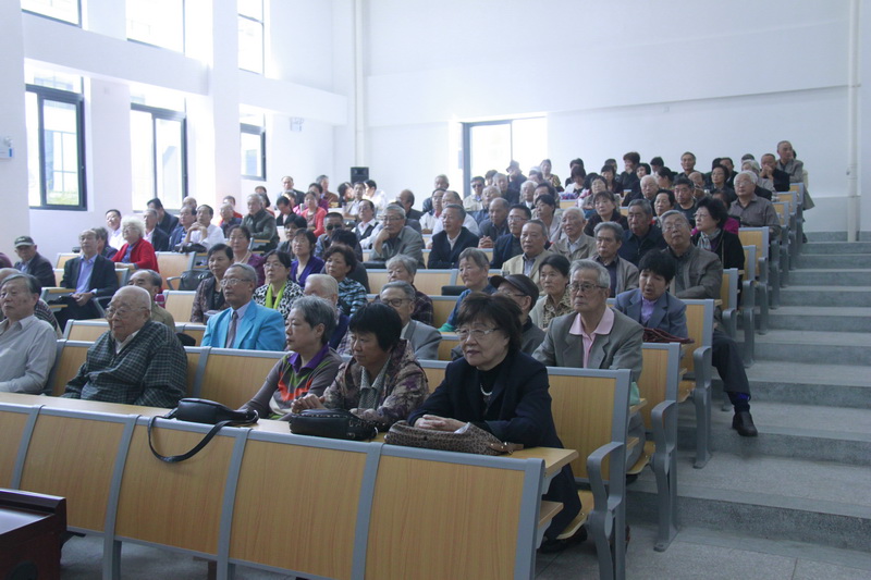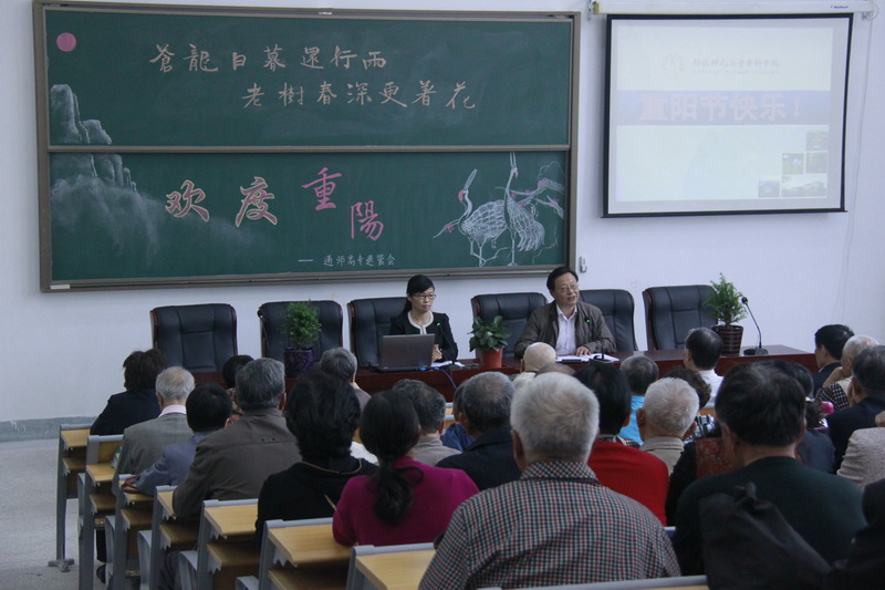 上午9点半,朱月萍校长代表学校向老同志报告了学校近年来发展、建设的有关情况,向11位整十岁生日的老寿星颁发了长寿纪念品,祝愿全校老同志节日愉快、身体健康、家庭美满!会后丁兆雄书记、朱月萍校长、陈情副校长等领导与老同志们合影留念并陪同他们参观了校园。