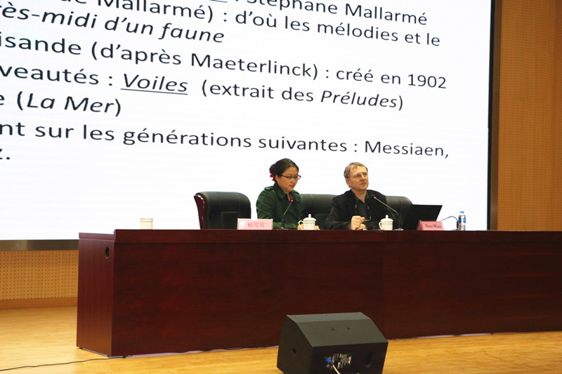 2016年3月31日,法国著名教授皮埃尔·米歇尔于我校图文信息楼小报告厅举办了题为“二战后法国当代音乐的发展”的讲座,从印象派作曲家德彪西、当代音乐作曲家梅西安入手,讲述了二战后法国音乐的发展流程及现当代音乐的发展趋势,介绍了频谱音乐的创作规律等,受到在场师生的热烈欢迎,并与大家进行了愉快的交流。