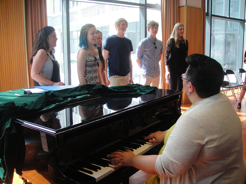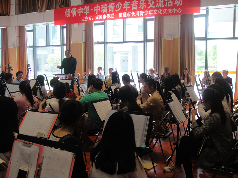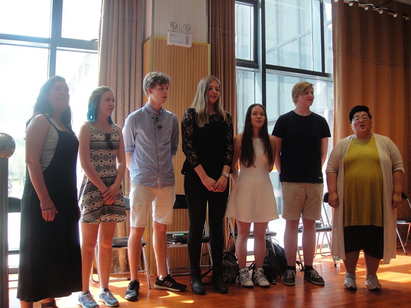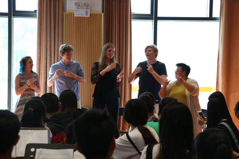 访问团首先参观了校史馆,经过简单的介绍初步了解了本校的历史与现状。其后,众人到音乐系排练厅观摩了民乐团的排练。两首经典曲目——《红楼梦序曲》与《庆典序曲》的演奏婉约柔美与大气磅礴兼具,技艺娴熟,获得了访问团师生的热烈欢迎,并给予了极高评价。访问团成员们随即与在座师生进行了愉快的互动交流。他们带来了具有北欧风情的合唱,并带领同学们学习了用肢体敲击节奏的奇趣表演方式,全场氛围达到高潮。