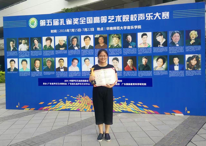 在2016年7月16至22日在广州举办的第五届“孔雀奖”全国高等艺术院校声乐大赛中,音乐系12级李一君同学经过复赛、决赛的激烈角逐,最终获得高职高专院校民族组“三等奖”(一、二三等奖各一名),刘宁妹教授获得“孔雀奖优秀指导教师奖”。