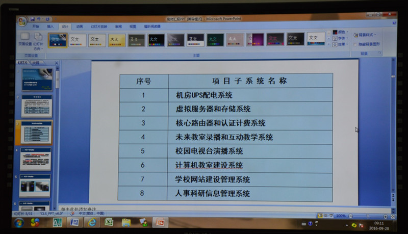我校新校区数字化校园项目今年4月份启动建设,包括中心机房配电系统、虚拟服务器和存储系统、核心网络设备和认证计费系统、未来教室录播教学系统、校园电视台演播系统、2个计算机教室、网站管理系统、人事科研信息系统、师范生教学技能实训系统、网络实验室共10个项目。项目建设过程中,现教中心、使用部门与施工方密切配合,到8月份基本完工。暑假期间,现教中心组织对所有设备进行了清点,并向市财政局委托的第三方评估公司上海闻政提供了基础资料。