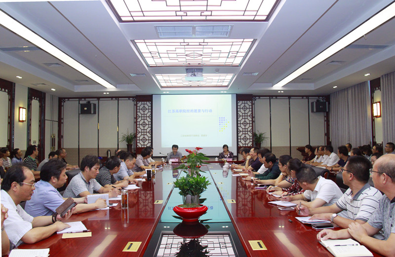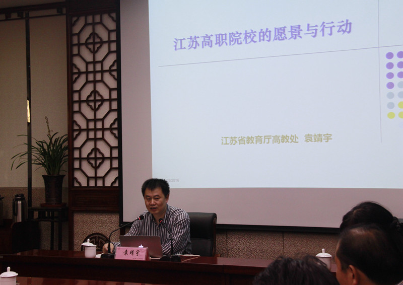 9月28日下午,江苏省教育厅高教处长袁靖宇博士莅临我校,在图文信息楼会议室作了《江苏高职院校的愿景与行动》的专题报告。报告会由校长朱月萍主持,市教育局高等教育与职业教育处处长陈斌、副处长黄卫平,学校领导、中层部门负责人及教研室主任聆听了报告会。