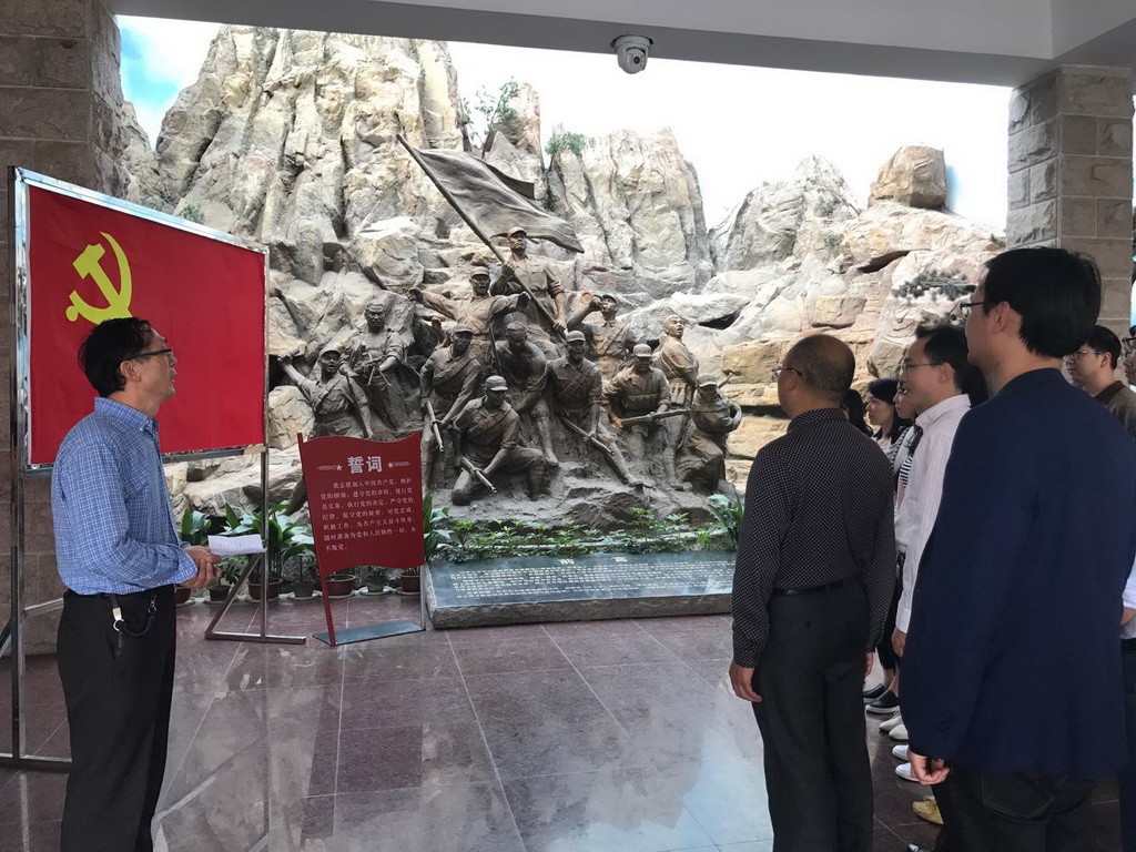 活动开始,首先由信息技术系支部副书记曹斌同志简要介绍这次活动的目的和主要安排。然后在茅山新四军纪念馆大厅,全体党员同志面对鲜红的党旗齐唱《国际歌》,图文信息支部书记陆永来同志带领大家重温入党誓词。接着校党委委员张松祥同志对全体党员同志提出三点希望:一是有国家观念。在思想观念上做到心中始终有党有国,牢记党员身份,自觉提高党性;二是有学校情怀。自觉把自己个人成长与学校事业发展结合起来,与学校发展同呼共吸、同心同德;三是有实干精神。既要发展好自己,又要履行好职责,以实实在在的工作业绩来彰显先进性。