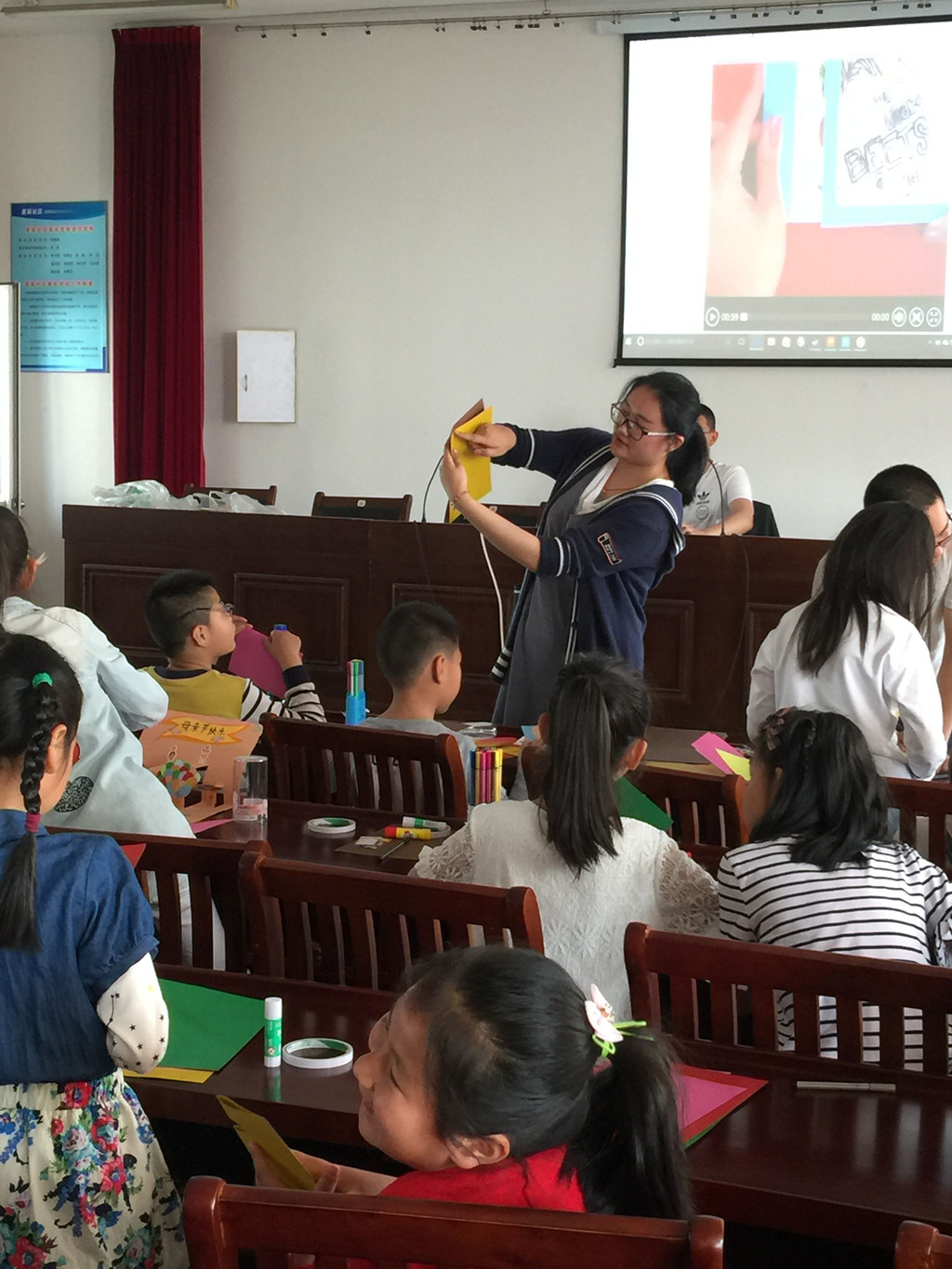 15美术(1)班同学利用自己的美术专长,指导孩子们在“边做、边玩、边聊”的轻松氛围中,制作了一张张独一无二的贺卡。