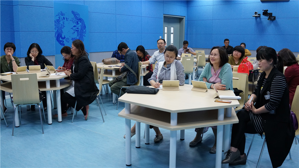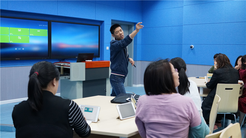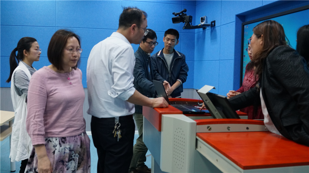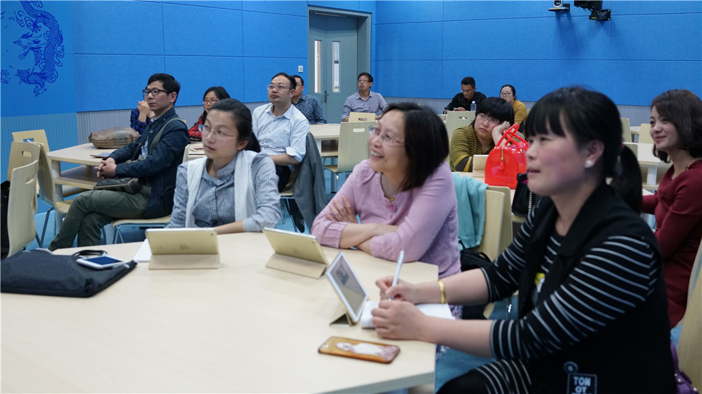 中广上洋公司的梁晋工程师进行了现场讲解与演示,内容包括未来教室的硬件设备、录播系统、StarC云端一体化学习平台、双板教学系统、ipad课堂交互软件等,老师们现场体验课堂录播、iPad教学等。