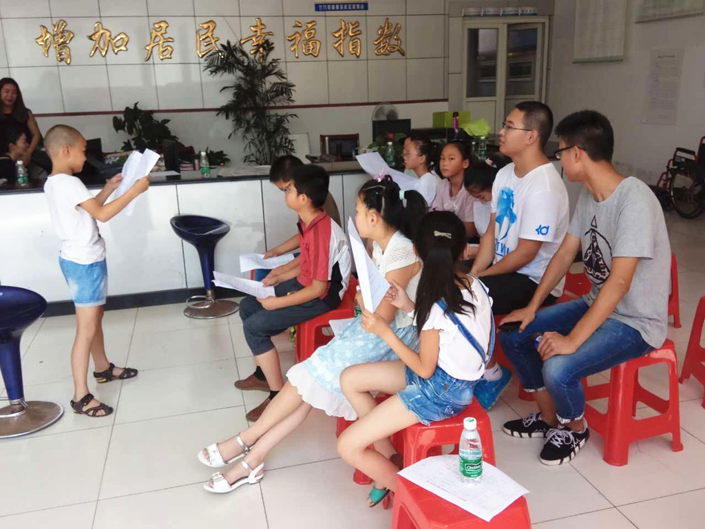 在活动开始前,志愿者们在带队老师的指导下,精心策划活动内容,与社区工作人员充分沟通,做好活动的各项准备工作。在每一次活动中,带队老师和志愿者们顶着烈日前往活动场馆,与小朋友们快乐相约,活动有:舞蹈、唱歌、朗诵、课本剧、相声等等。志愿者们教得认真,小朋友们学得开心,家长们看着欢喜。室外艳阳炙烤,场内其乐融融,不时传出小朋友们的朗朗书声、童稚歌声和欢快笑声。