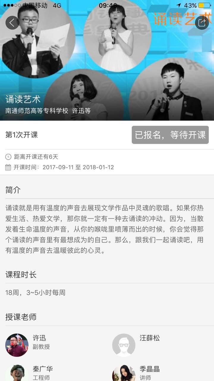 自今年4月,江苏省教育厅下发《关于公布2016-2017年高等学校在线开放课程立项建设名单的通知》(苏教高函﹝2017)13号),公布2016-2017年“十三五”高等学校在线开放课程立项建设评审结果,我校人文系《诵读艺术》课程获准立项之后,经过近半年的周密筹划、精细制作,目前该课程已通过上线审核,将于9月11日在“中国大学慕课网”正式上线开课。