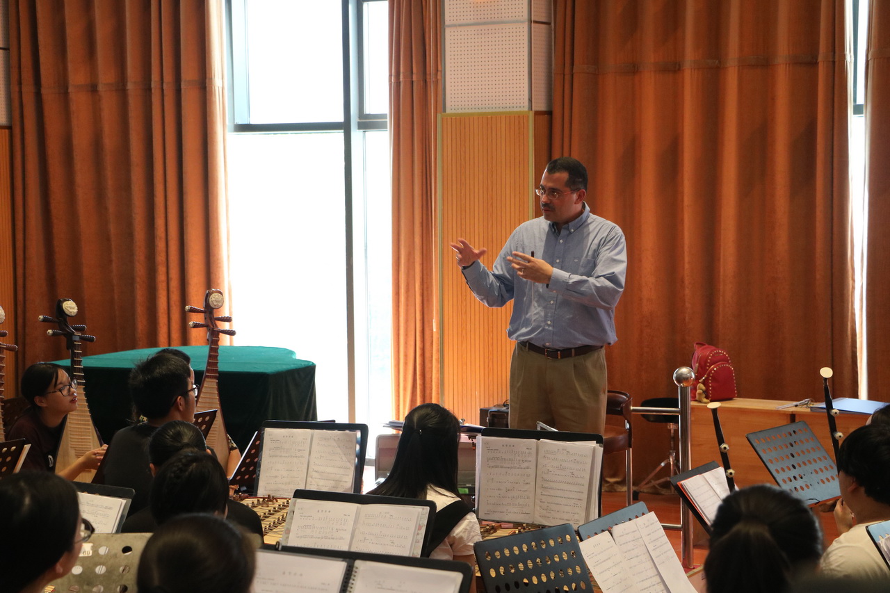 Richard Cangro 教授参观并指导了音乐系多场教学活动。在民族乐团排练过程中,他结合自己多年来从事音乐教学的切身体会与宝贵经验,从乐团声部的平衡、音准、节奏和强弱等四大方面讲述了乐团表现力的体现和理念;在艺术实践课中,他对音乐风格、音阶练习的作用、“练习”的真谛、音值的重要性等方面进行了详尽的讲述与示范;在聆听视唱课程“D大调正三和弦的构唱与听辨”后,他讲解了怎样解决视唱练耳中的音准问题,又提出练耳听辨在视唱教学中的重要性。