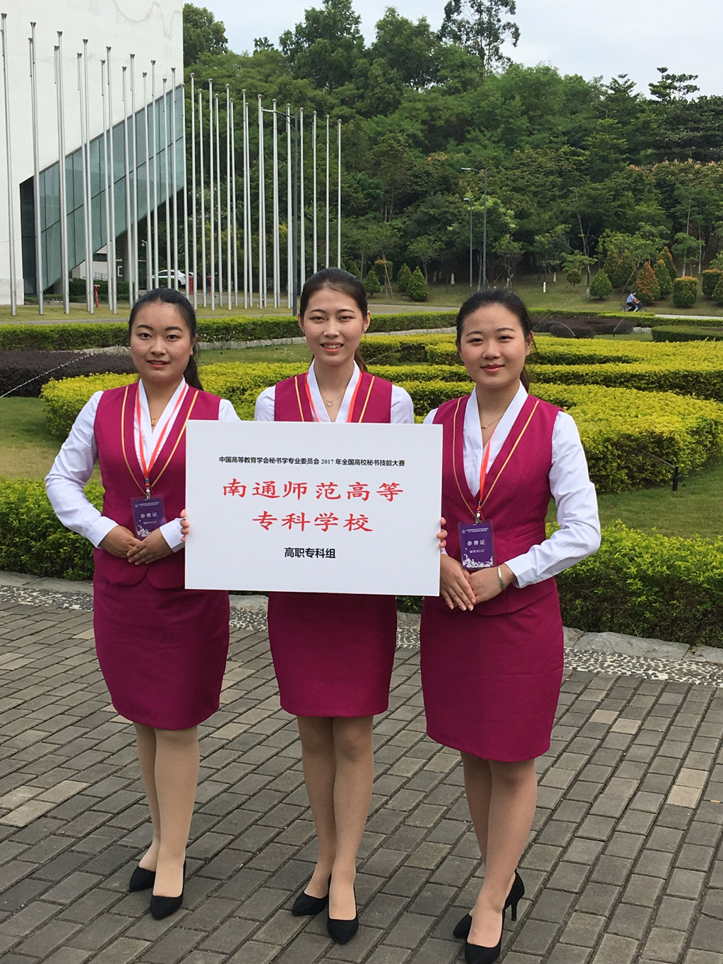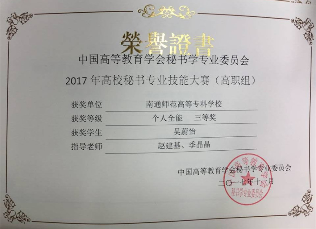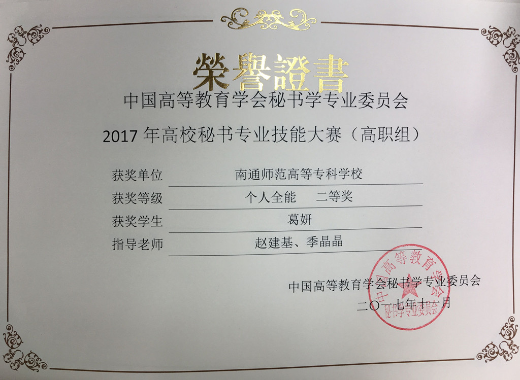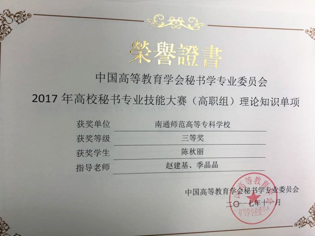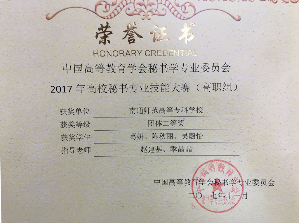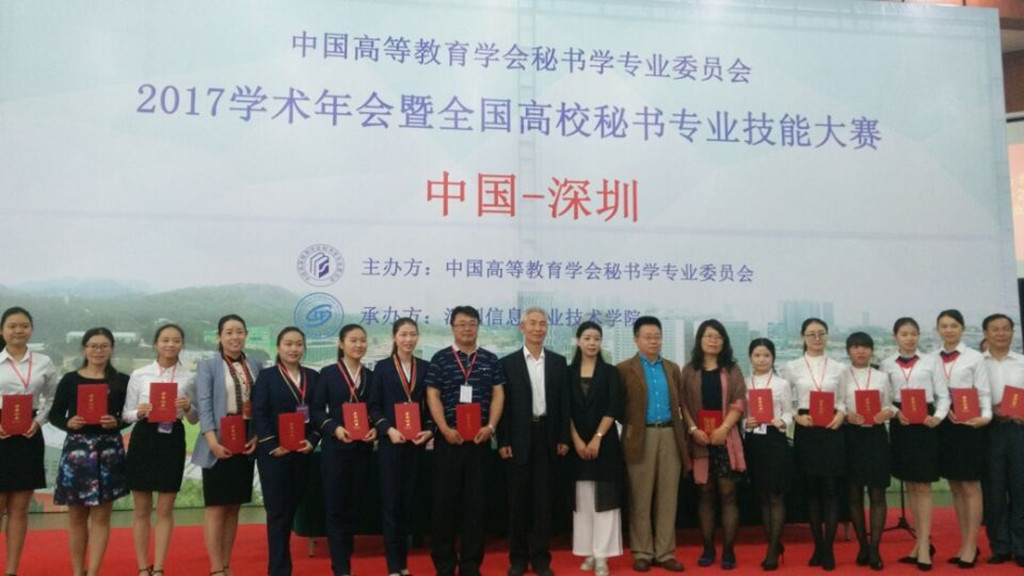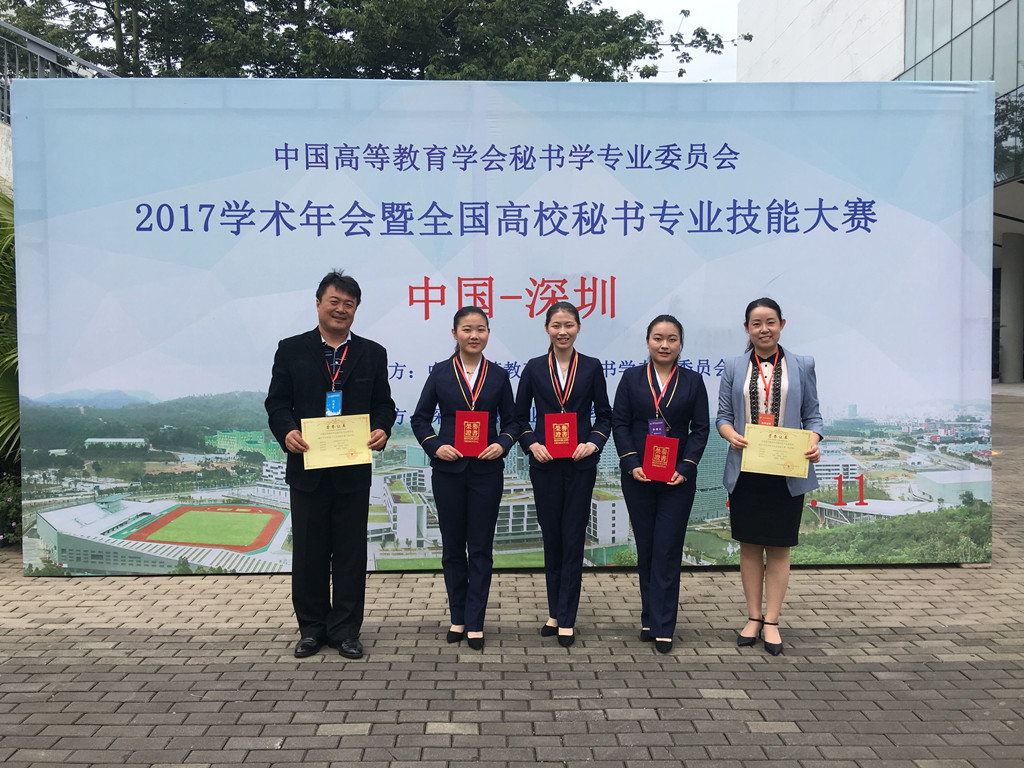 2017 年全国秘书职业技能大赛于11月4日-6日在深圳市信息职业技术学院举行,我校人文系文秘专业赵建基、季晶晶两位老师带领文秘15班葛妍、吴蔚怡、陈秋丽三位同学参加了本次大赛。经过秘书理论、秘书实务操作、秘书实务情景展示、即兴演讲和才艺表演这五个环节的比赛,我校参赛队荣获高职组团体二等奖。葛妍同学获秘书综合技能二等奖,吴蔚怡、陈秋丽二位同学获得秘书综合技能三等奖。