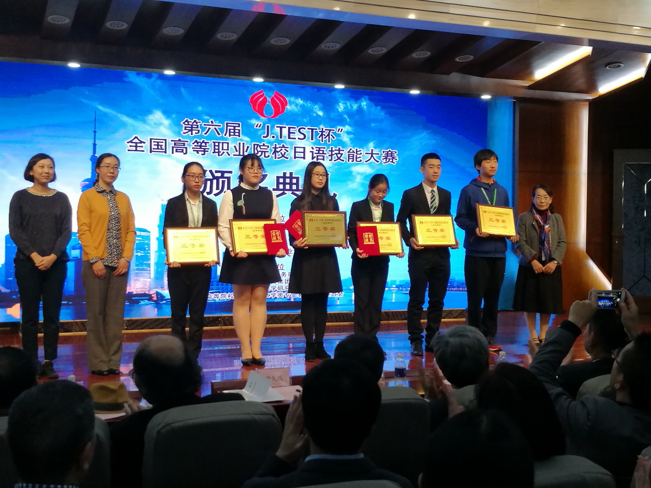 本次大赛由教育部职业院校外语类专业教学指导委员会主办,日本J.TEST中国事务局、日本驻华大使馆、中国日语教学研究会、教育部高等院校外国语言文学类专业教学委员会日语分委员会协办,上海工商外国语职业学院承办,共有来自全国各地的46所院校、200多名选手参加比赛。个人赛中,盛诗雨、蒋靓凭借流畅的语言表达扎实的专业功底荣获个人赛三等奖。二人与沈忱、蔡宇辰、徐沁馨组成团队进行团体赛角逐,荣获团体赛三等奖。冯洁、张静、管鹏三位老师荣获优秀指导教师奖。