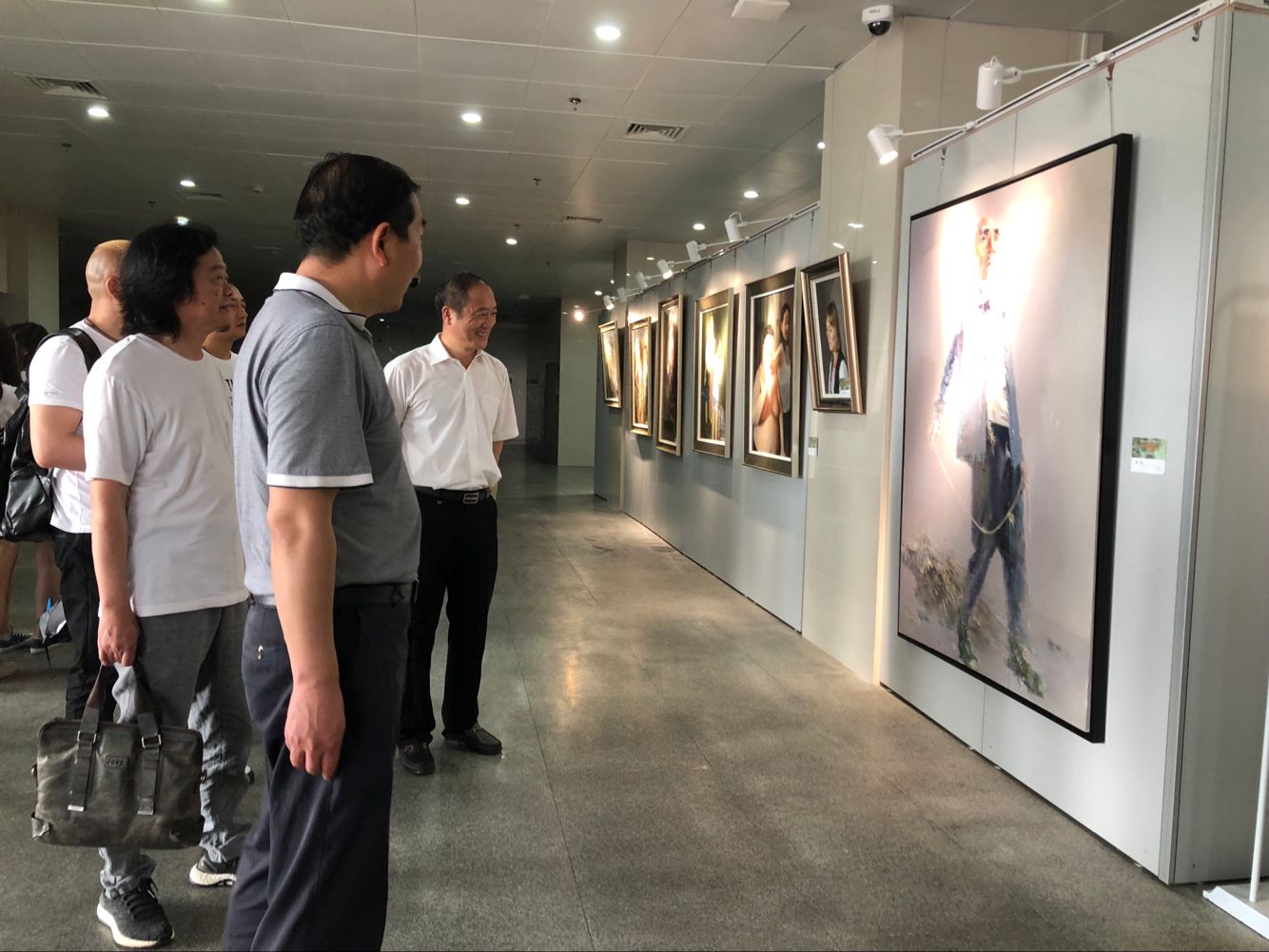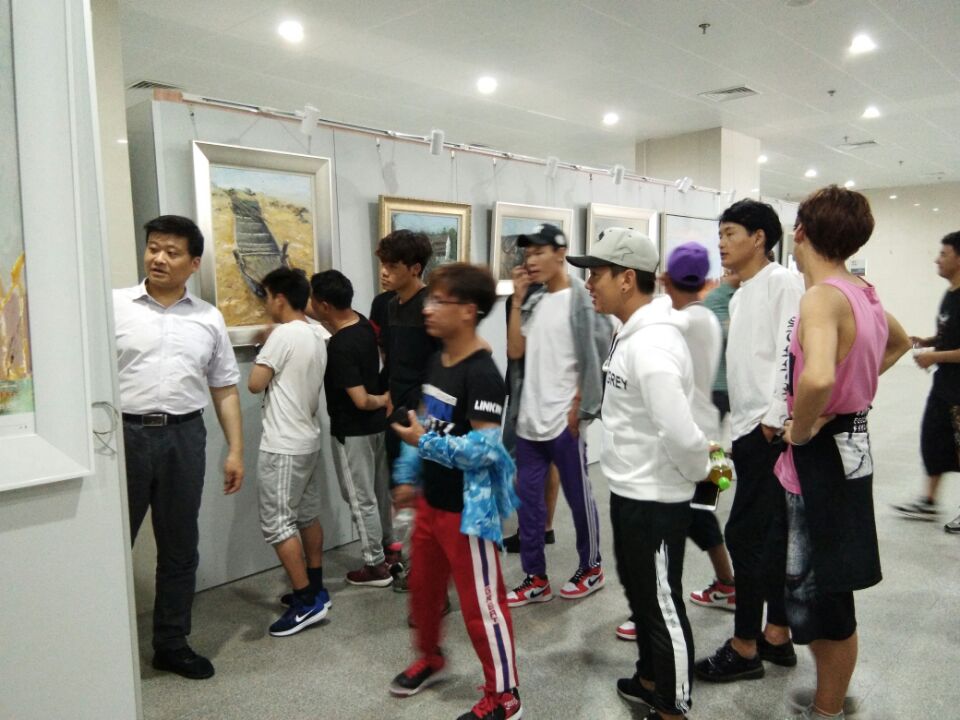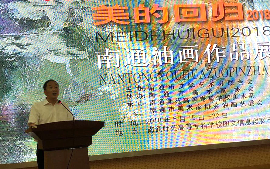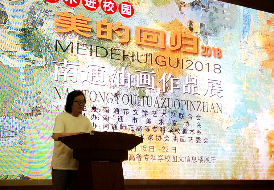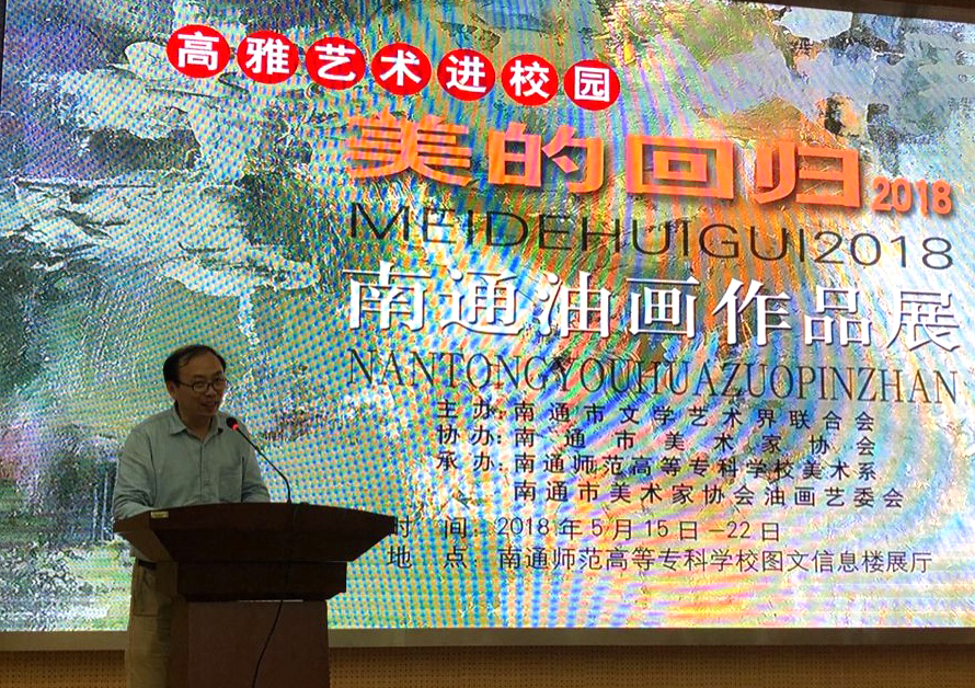 开幕式由美术系副主任朱敏主持。首先,美术系主任陈竹林代表美术系师生感谢市文联和美协为我校的审美教育创设了 一个真实的教学情境,确信,这样的情境对我校的美术教学内容的优化和教学模式的创新具有现实的参考价值。接着, 市文联副主席陈国强作了热情洋溢的讲话,他说,展出的46件作品,题材多样,形式新颖,个性鲜明,是南通市美术家协会油画艺委会老中青三代创作骨干近期创作的佳作,是他们积极践行习近平总书记系列重要讲话精神,坚持深入生活、扎根人民,用画笔描绘新时代江海大地的发展新貌,记录南通人民改革追梦火热场景的艺术成果, 彰显了美术家对新时代审美价值取向的深层次思考。