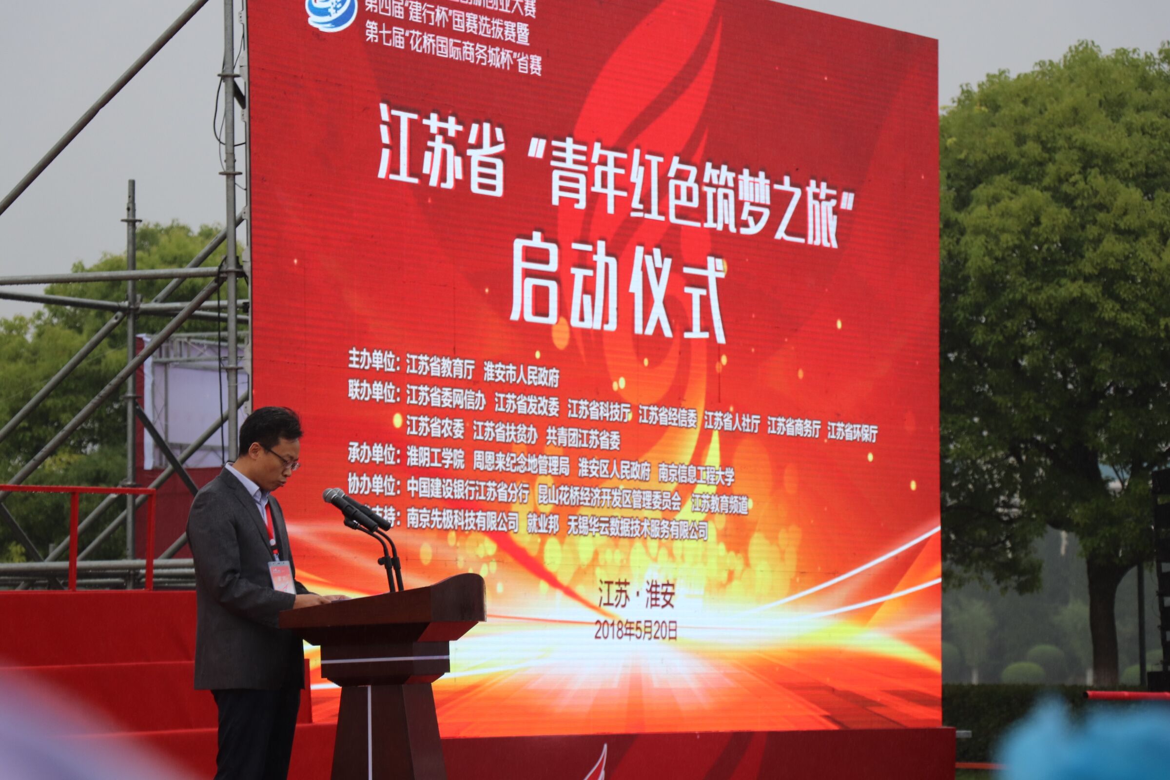 省教育厅副厅长王成斌,中共淮安市委常委、淮安市人民政府常务副市长戚寿余,教育部高教司理工处处长吴爱华,淮阴工学院党委书记章跃,周恩来总理亲属周秉和出席启动仪式并致辞。省委农工办(省扶贫办)副主任许善平,团省委副书记潘文卿,淮阴工学院校长孙爱武,副校长吴建华、陆为群,中共淮安区委书记徐子佳,中国高校创新创业孵化器联盟秘书长、中关村网络教育产业联盟常务副秘书长陈静出席启动仪式。省教育厅副巡视员袁靖宇主持启动仪式。来自全省 68 所高校的 600 余名莘莘学子相聚在敬爱的周恩来总理的故乡,参与第四届江苏“互联网+”大学生创新创业大赛“青年红色筑梦之旅”活动启动仪式。