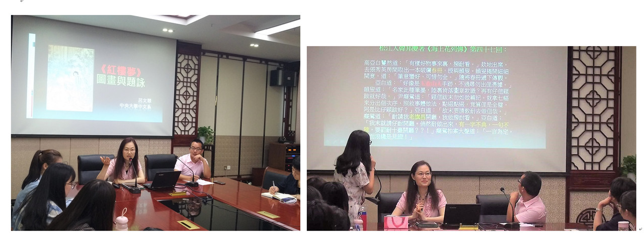 吕文翠教授的讲座《<红楼梦>图画与题咏》从图画入手,对改琦创作的《红楼梦图咏》第一册、第四册进行了简要的讲解,从“黛玉图”到“史湘云图”再到“妙玉图”,从贾宝玉到秦可卿再到甄宝玉,在座的老师与同学们跟随着吕教授的脚步,从若干图片中,既游历了红楼梦人物,又看到了绘图者改琦白描笔法的精湛卓绝。于无字处说有声,让人赞叹不已。十分有趣的是,在讲到吴语小说的影响印痕时,吕教授还现场邀请一名苏州同学用方言读出《海上花列传》第四十七回的部分内容,让大家在充满魅力的方言中感受地域文化的深远影响。