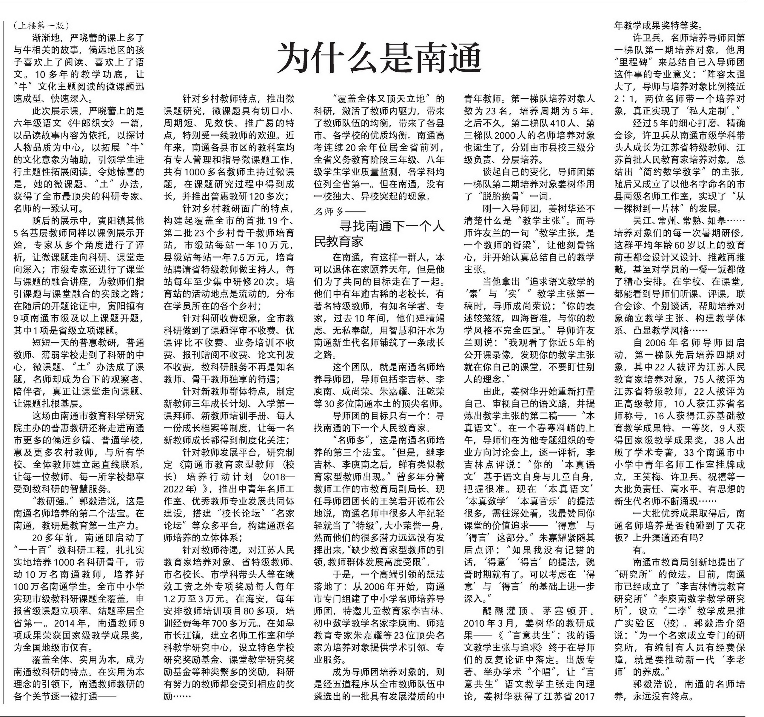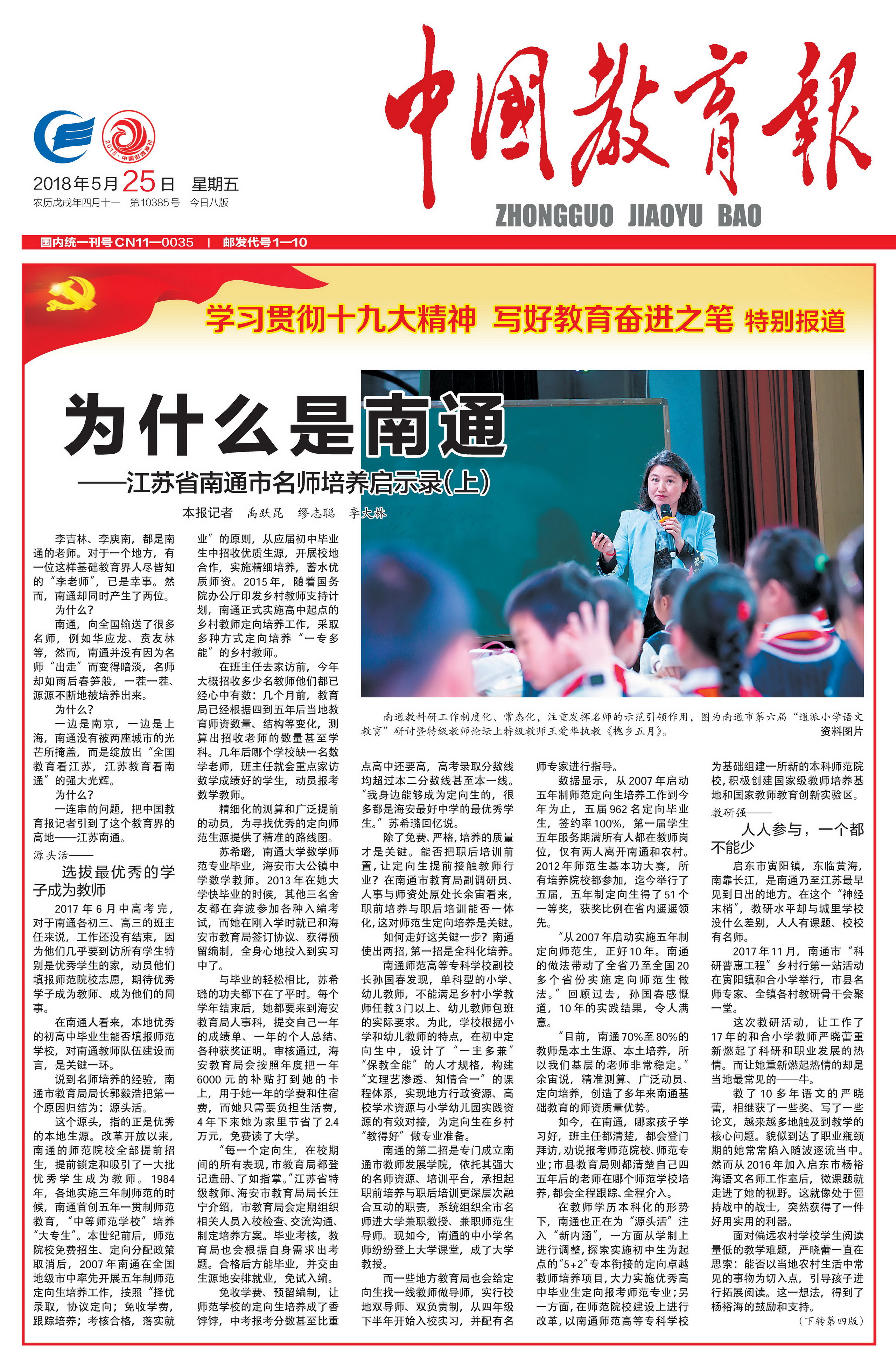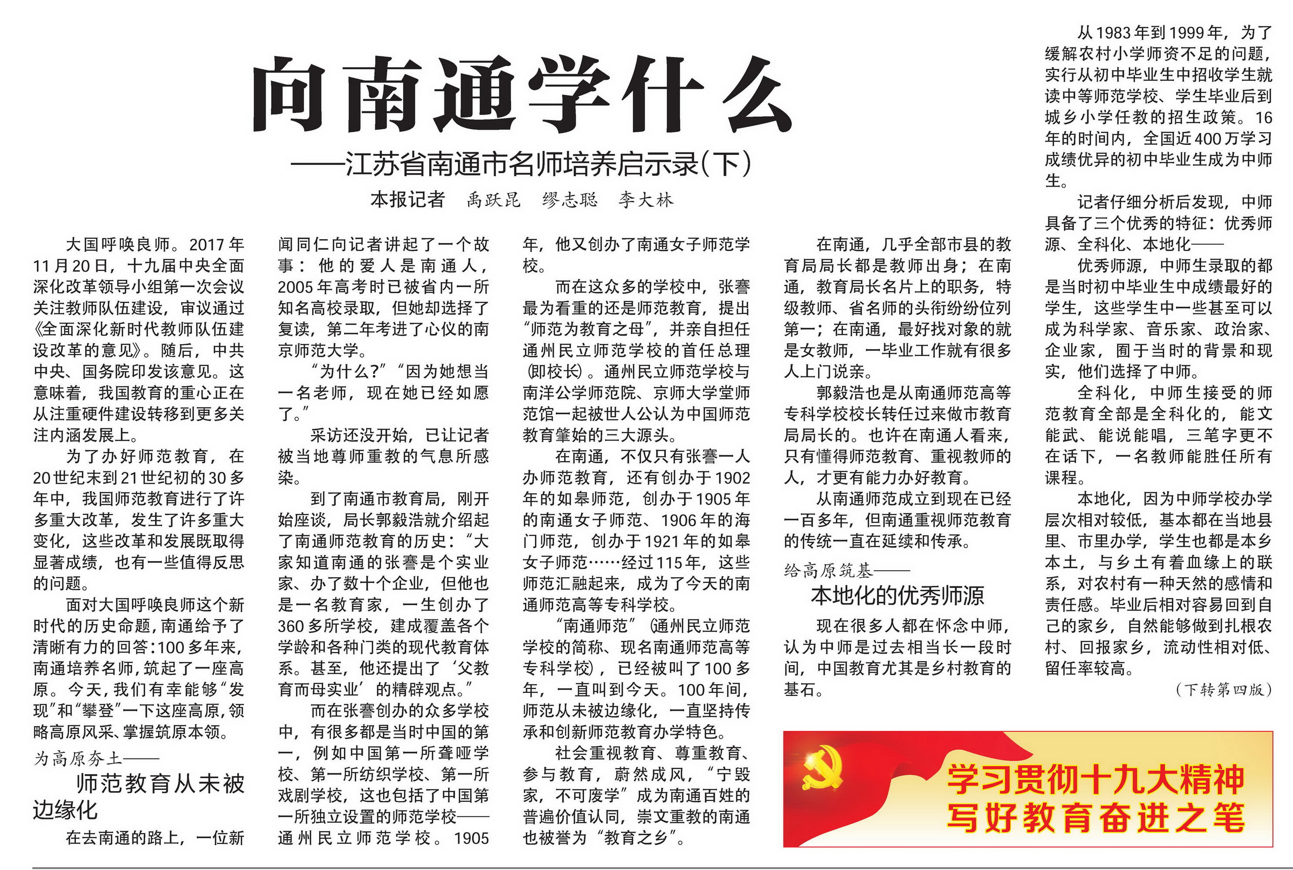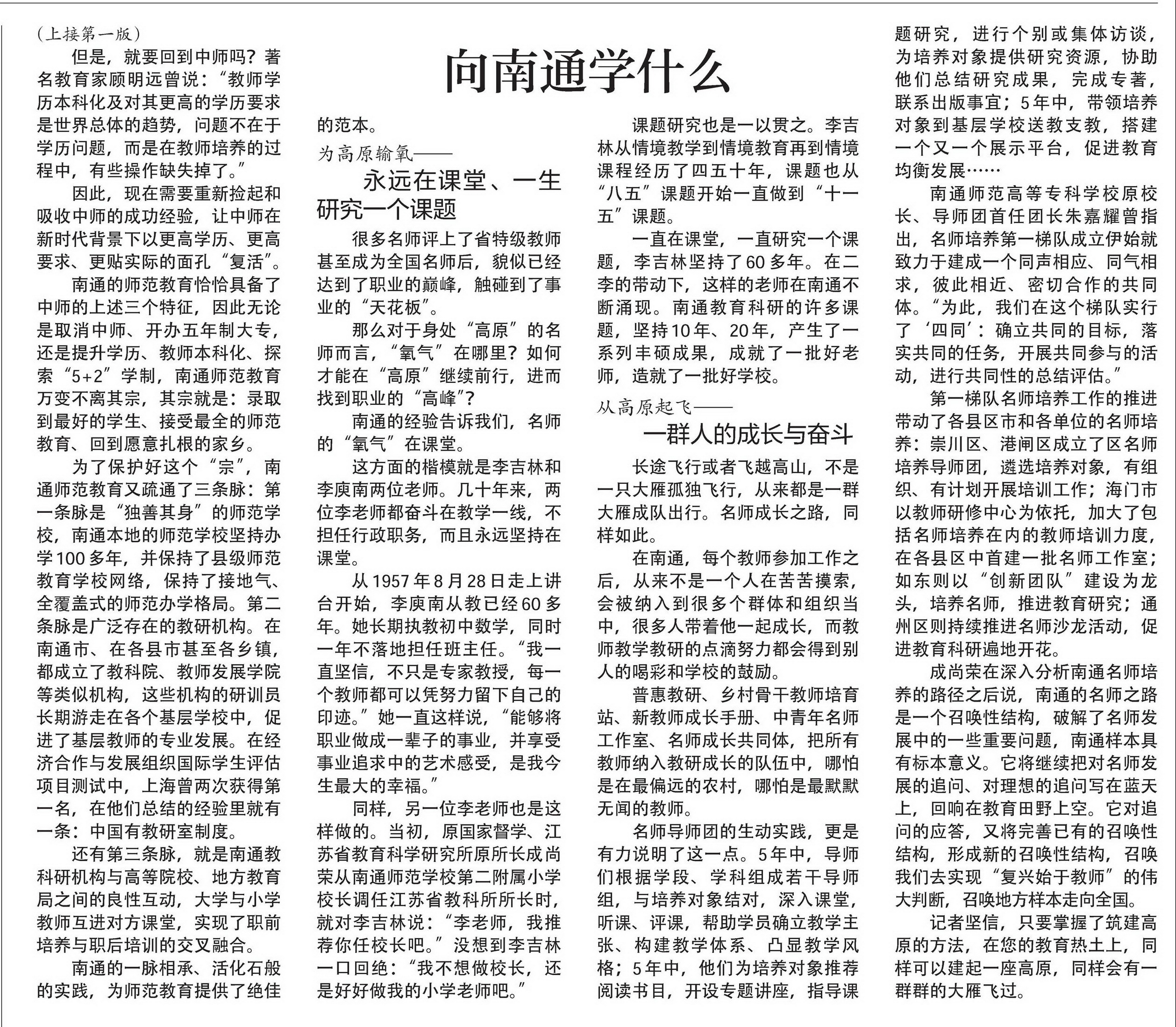 5月25日、26日,《中国教育报》连续两个头版刊登了《为什么是南通——江苏省南通市名师培养启示录上》、《向南通学什么——江苏省南通市名师培养启示录下》长篇通讯。文中多次介绍我校的历史以及我校师范生培养工作。现全文转载,供广大师生员工学习参考。