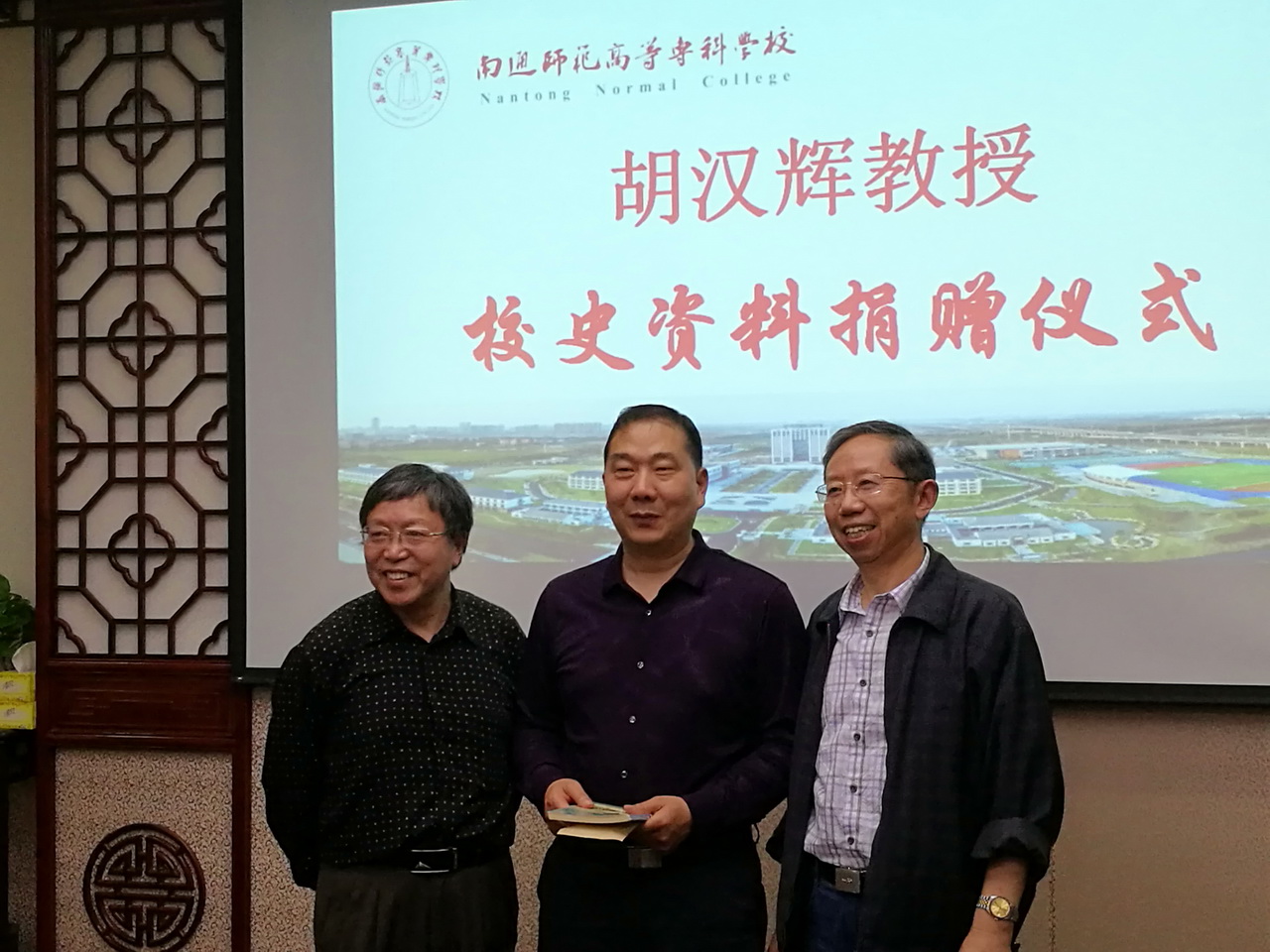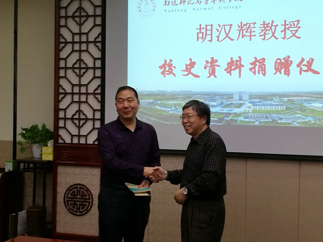 5月31日下午,胡汉辉教授“校史资料”捐赠仪式在图文信息中心会议室举行。胡汉辉为东南大学教授、博士生导师,其外公胡履之先生曾任通州师范事务主任,并兼任南通博物苑主任。抗日战争全面爆发后,1938年6月常驻迁校办事处的学校事务主任胡履之与校长于敬之、教导主任顾怡生等毅然借南通县近海二附校舍作为侨校复课。胡教授深情回忆了这段历史及其父母在通州师范学习、生活的历程。捐赠仪式上,胡教授捐赠了其外公生前使用的印章、朱德祥先生(全国著名几何学家、教育家,1932年毕业于通州师范学校)上世纪八十年代回忆其老师胡履之的手稿等珍贵资料,我校孙国春副校长代表学校接受了捐赠,并代表学校对胡汉辉教授的慷慨捐赠表示感谢。