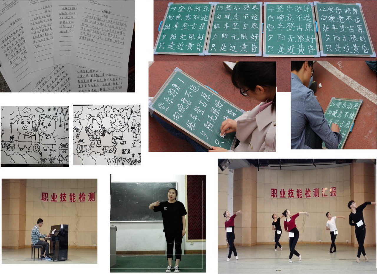本次检测汇报活动是以本真的专业职业技能测试的方式进行,全体学生参与了钢笔字、粉笔字、钢琴弹唱、舞蹈、儿歌、讲故事、简笔画组合构图等涵盖学前教育专业所有核心技能项目的检测。参加检测的15初招、16高招所有班级都高度重视,在班主任的组织下认真准备,刻苦练习,检测过程中学生的表现得到师生们的认可和赞许。在每场检测结束后评委老师都会进行现场点评,为检测学生和低年级观摩的学生作技能训练方面的技术指导。