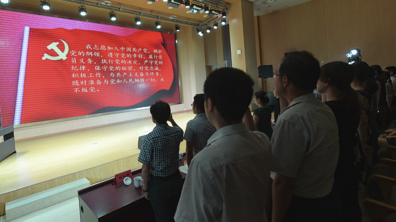 活动在全场高唱国歌中拉开帷幕。在党委委员郭庆同志领誓下,与会党员一起重温入党誓词。