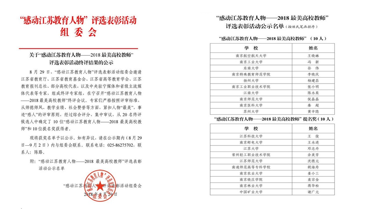 8月29日,“感动江苏教育人物”评选表彰活动组委会邀请江苏省教育厅、江苏省教育基金会、江苏省高等教育学会、江苏教育报刊总社、部分高校代表,以及中央驻宁媒体和省级主流媒体代表等专家,组成终专家组,在宁召开“感动江苏教育人物——2018最美高校教师”终评会议。专家们严格按照评审标准,从师德师风、教学业绩、社会赞誉等方面,紧扣人物“最美”,事迹“感人”的评审原则,经过综合评分、集中审议,从20名终评候选人中确定了10位“感动江苏教育人物——2018最美高校教师”和10位提名奖获得者。我校胡海舟教授荣获“ 2018最美高校教师 ”提名奖。