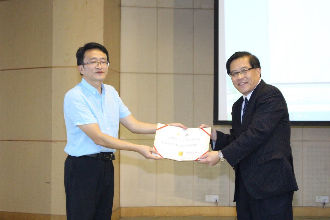 彭教授为我校与日本京都外国语大学建立友好合作关系、为中日友好做出了积极的贡献。在全校上下隆重纪念第34个教师节这样一个特别的日子,彭教授欣然接受我校邀请,聘为客座教授。学校党委委员、副校长都樾同志,特代表学校致辞并颁发证书。