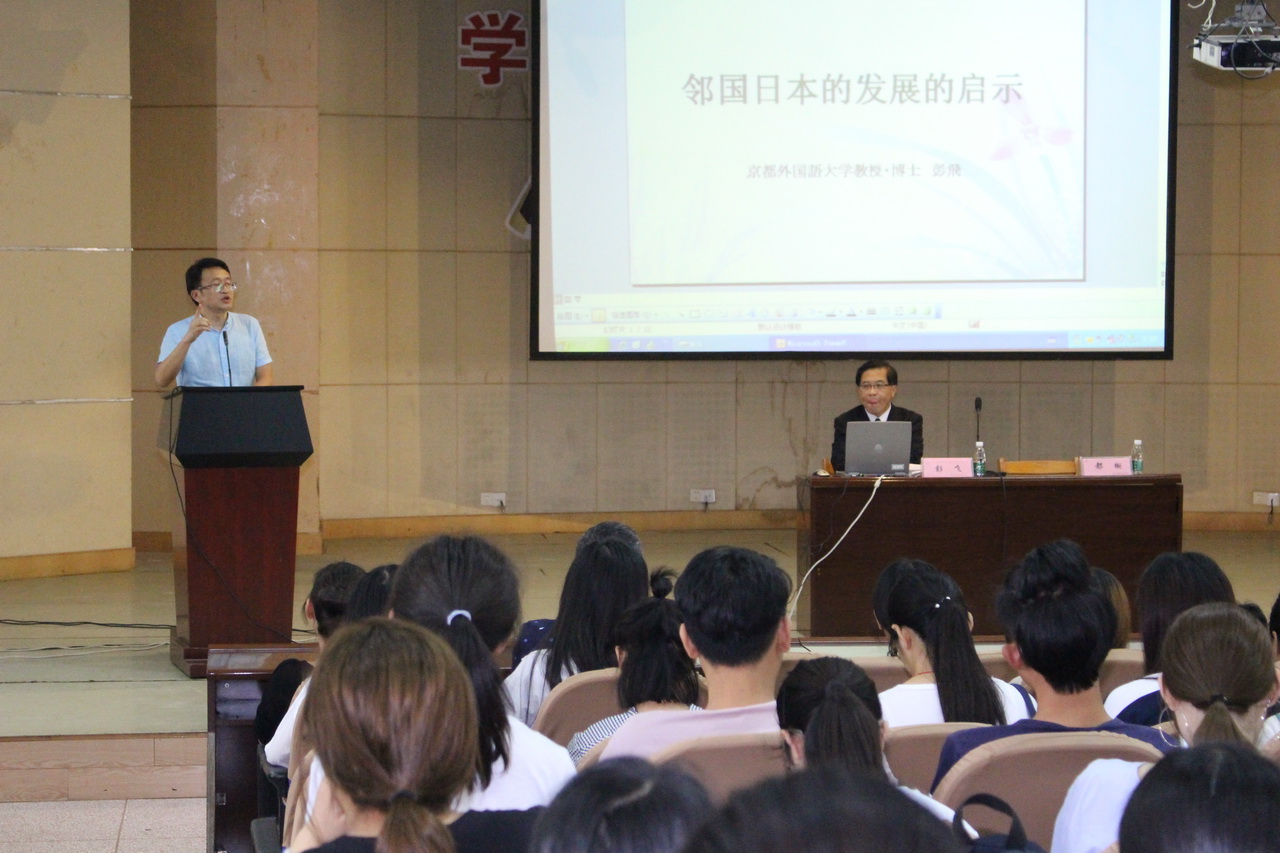 9月10日上午,彭教授还与外语系领导、外语系兼职教授姜熊烽先生以及日语专业教师代表等有关人员,就日语专业学习与专业发展、学术研究和国际合作交流等进行了坦诚、亲切的交流;并再次向我校捐赠了一批日语学术专著与日语学习资料。下午,彭教授拨冗为南通校区四个系的部分教师与高招学生作了《邻国日本的发展的启示》讲演。彭教授站在文化与学术的高度,以其独有的幽默、睿智而又很接地气的方式,举重若轻地将其对日本社会发展的观察与思考,放到一个大的视角里去进行比照、探究,让人眼界大开。彭教授精彩的讲演,赢得了与会者的阵阵掌声。这也是我们对这个特别日子的特别纪念!