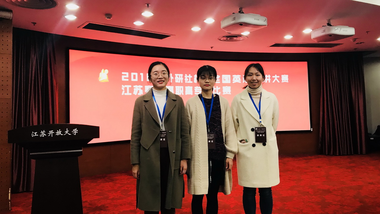 2018年11月16日,我校外语系2014级英语教育专业的汤文欣、姜玲慧同学,与人文系2015级小学教育专业(1)班的张弛同学,在外语系副主任丁爱琴、指导老师杨丽的带领下,参加了在江苏开放大学举行的2018“外研社杯”全国英语演讲比赛(江苏赛区)高职高专组比赛。