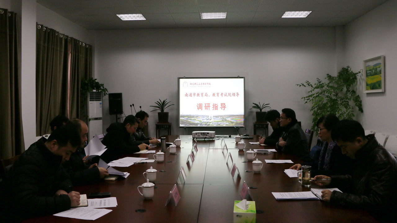 为进一步规范2019年招生工作,切实维护广大考生权益,稳定招生秩序,广泛征求意见和建议,1月15日上午,南通市教育局高教与职教处处 长朱宁,南通市教育考试院院长吉海波、副院长李志丹、中招科长徐社华,市教育局高教与职教处副处长鲍宏扬一行五人来我校调研指导。专题调研会在时孙楼105会议室举行。我校党委书记刘锋、校长朱月萍、副校长都樾、招就处副处长顾友斌、招就处科长盛斌参加调研会。