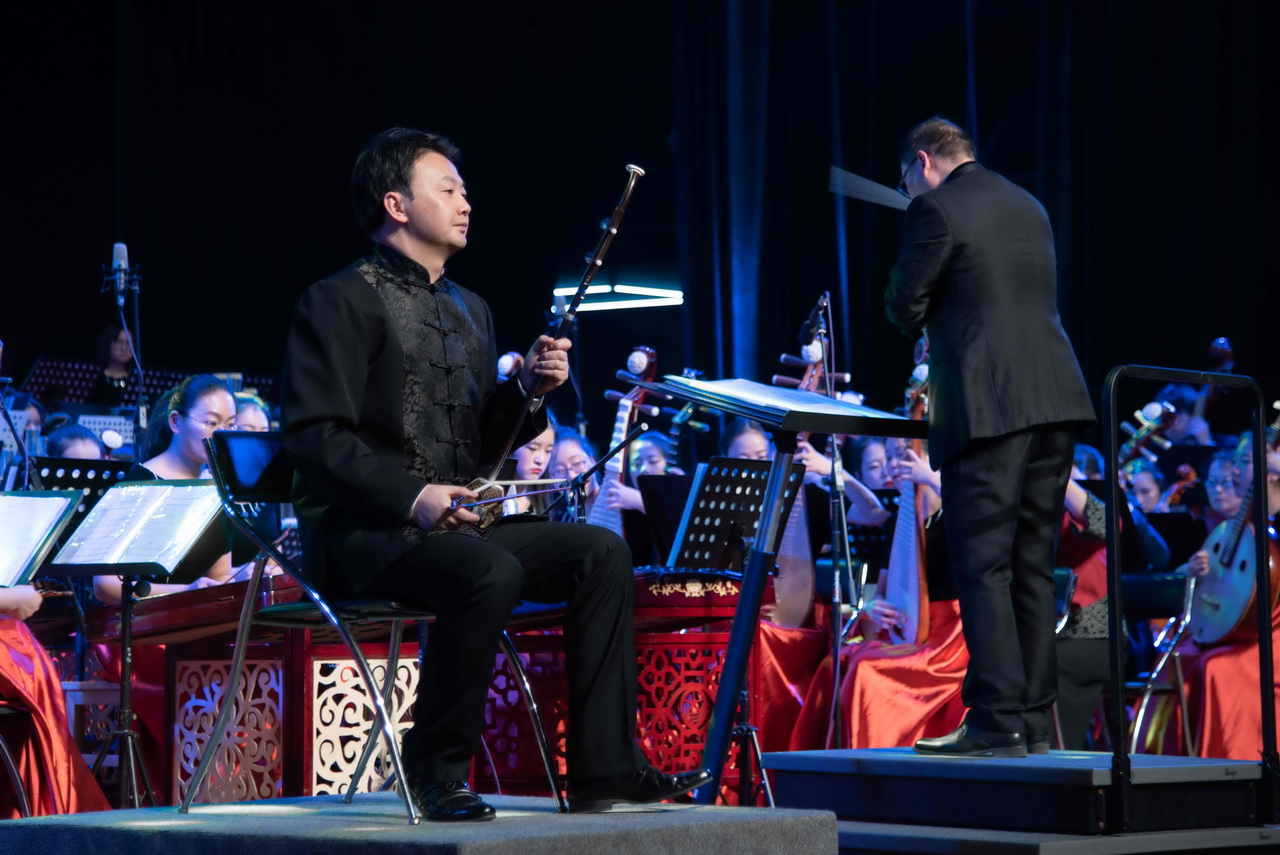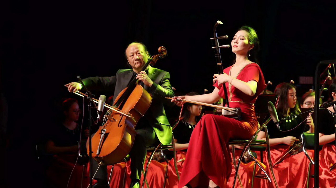 一曲《北京喜讯到边寨》磅礴开场。随后乐团倾情演绎《古槐寻根》,倾诉着黄土地滋养下的人们对故土的浓浓眷恋。由特邀小提琴秦放老师和李梓老师共同演绎的《九儿》直击人心。二胡卞娴老师和特邀鲁健军老师将流行曲《菊花台》改编为二胡、大提琴二重奏。有情有景,时空变换,别具一格。“云想衣裳花想容,春风拂栏露华浓。”琵琶协奏曲《云想花想》,特邀琵琶演奏家曹月老师与乐团密切配合,用唯美的旋律,以及灵动雀跃,跌宕起伏的舞蹈性节奏,展现了如诉如泣、娓娓道来的深切情思。 《印象国乐—大曲》由作曲家姜莹创作的,恢宏大气的音乐语言彰显着中国文化厚重的历史和悠远的底蕴。《丰收》营造出丰收时的节日气氛,表达出劳动人民丰收时的喜悦心情。民族管弦乐《音诗-沙迪尔传奇》由著名作曲家刘湲创作,乐器的沉吟营造出紧张神秘的气氛,而后以欢乐朝气的音乐相邀,身不动而心雀跃,层起渐进的乐声将音乐会推向了高潮。由司云辰子老师演唱的《我爱你,塞北的雪》旋律优美抒情,舒展流畅,仿佛在眼前展现出一幅雪花漫天飘洒的北国风光画卷。 最后由特邀二胡演奏家召唤老师所领奏的二胡协奏曲《长城随想曲》全曲气势雄浑,乐团携手南通音协民乐团,巧妙地把西方协奏曲四乐章套曲的体裁形式与本民族的音乐结构发展手法结合在一起,形成了崭新的民族风格。
