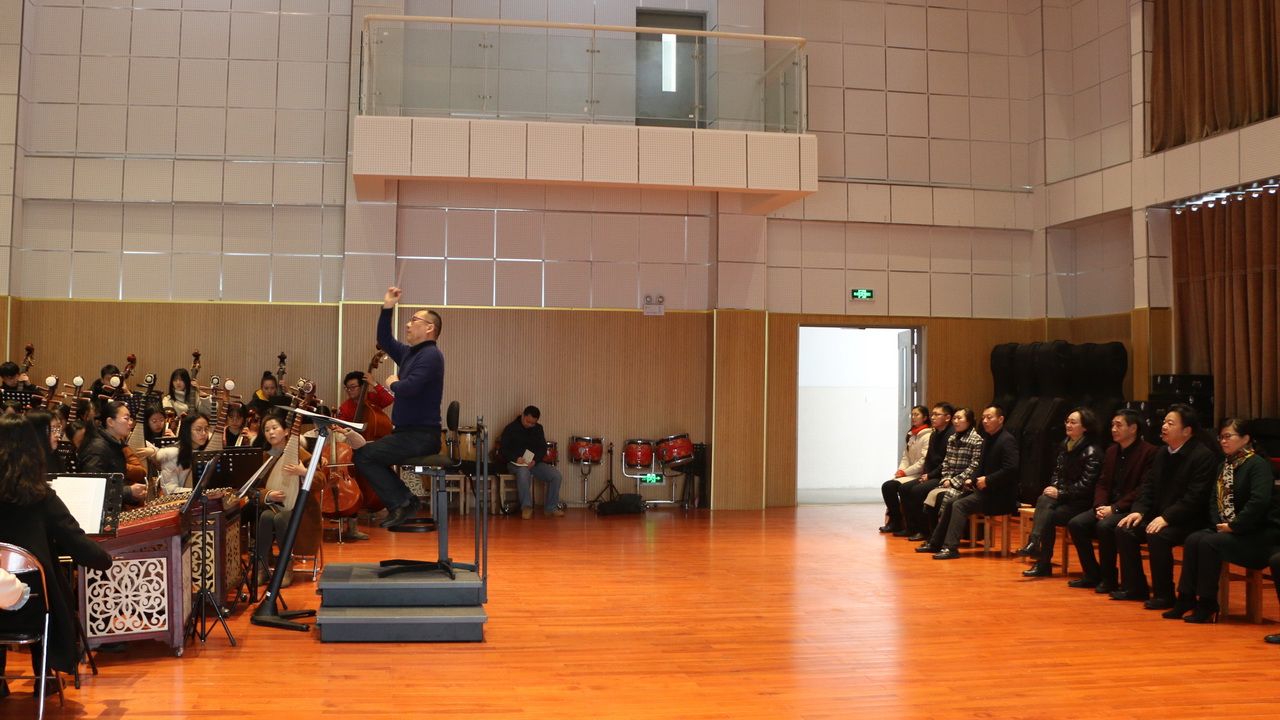 陆部长一行观摩了音乐舞蹈学院学生民族交响乐团排练情况,听取了学校党委书记刘锋关于音乐舞蹈学院艺术团建设情况的介绍和打造市级层面艺术团的设想和建议。