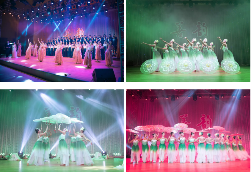 音乐舞蹈学院在本次活动中承担主要的演出任务,开场的“善韵”主题歌是由学院黄忠院长作曲、制作并录音的原创歌曲;舞蹈《茉莉花开》由陆娟和顾霞老师共同编排;配乐诗朗诵《请加入我们的行列》由南通市戏剧家协会、南通市朗诵学会和我院学生共同演绎;由施娓老师指导的琵琶重奏《送你一支玫瑰花》声声鼓,击响魅力之光,根根弦,颤动慈善和音;最后的歌舞《我和我的祖国》由学院师生同台表演,尤其还邀请了退休的施维老师和优秀毕业生同台演出,老、中、青三代共同为社会主义新时代的征程高歌。