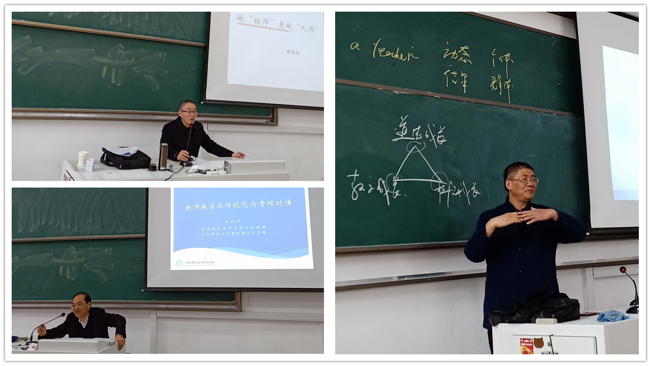 张建平、吴剑峰、胡海舟三位教授分别作了《高校初任教师专业成长的路径及策略》、《教学工作规范与考核标准》、《做“经师”更做“人师”》等专题报告。