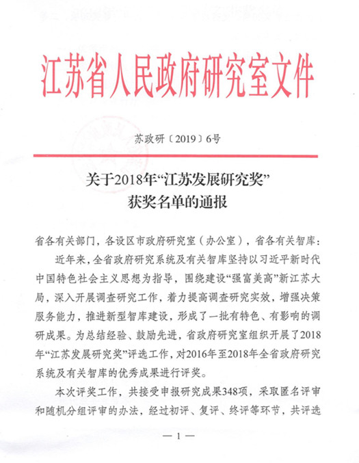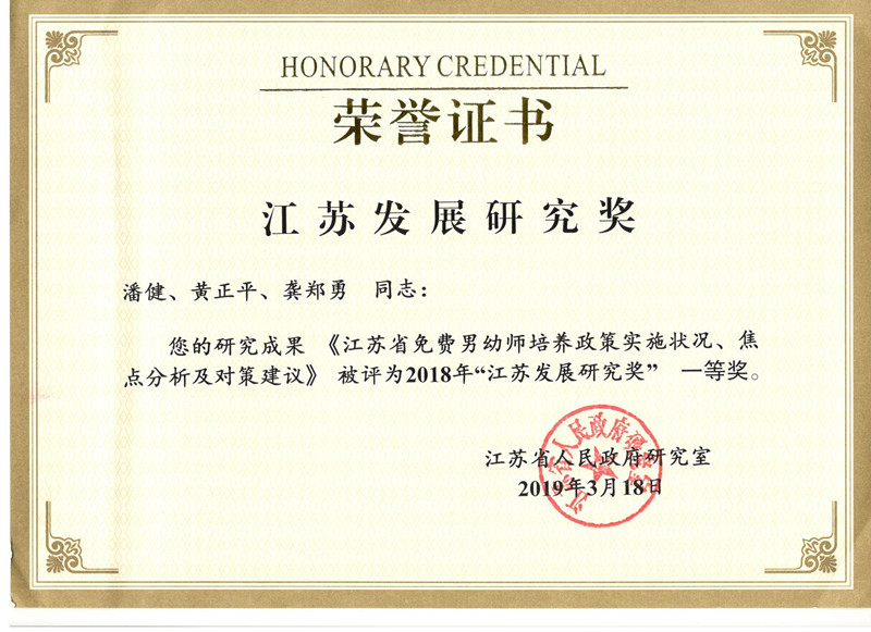 近日,江苏省人民政府研究室公布了“2018年江苏发展研究奖获奖名单”(苏政研[2019]6号),由我校潘健教授、龚郑勇副教授等撰写的决策咨询报告《江苏省免费男幼师培养政策实施状况、焦点分析及对策建议》获评优秀成果一等奖。