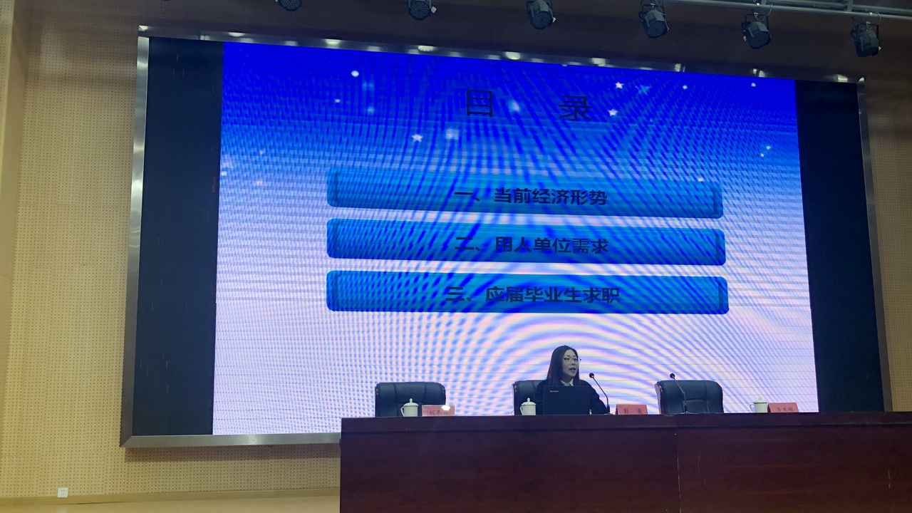 彭老师分别从当前经济形势,用人单位需求的四大特征,应届毕业生求职三个方面进行讲解。她以深入浅出的语言、生动鲜活的事例,并结合工作实际提出了自己的宝贵意见。她鼓励同学们在毕业前多进入求职现场,切身体验,实地考察用人单位的要求,明确就业方向,增加求职经验,提升职场应对能力。现场老师、同学们认真听取了讲座,并为彭老师生动、精彩的演讲报以热烈的掌声。