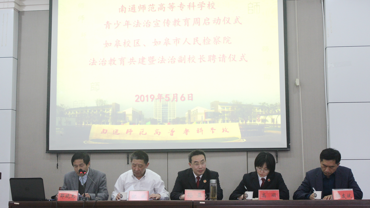 5月6日下午,南通师范高等专科学校青少年法治宣传教育周启动仪式在如皋校区举行,同时举行了如皋市人民检察院与如皋校区法治共建、聘请法治副校长仪式,并邀请如皋市人民检察院检察长孙亚同志做法治讲座。