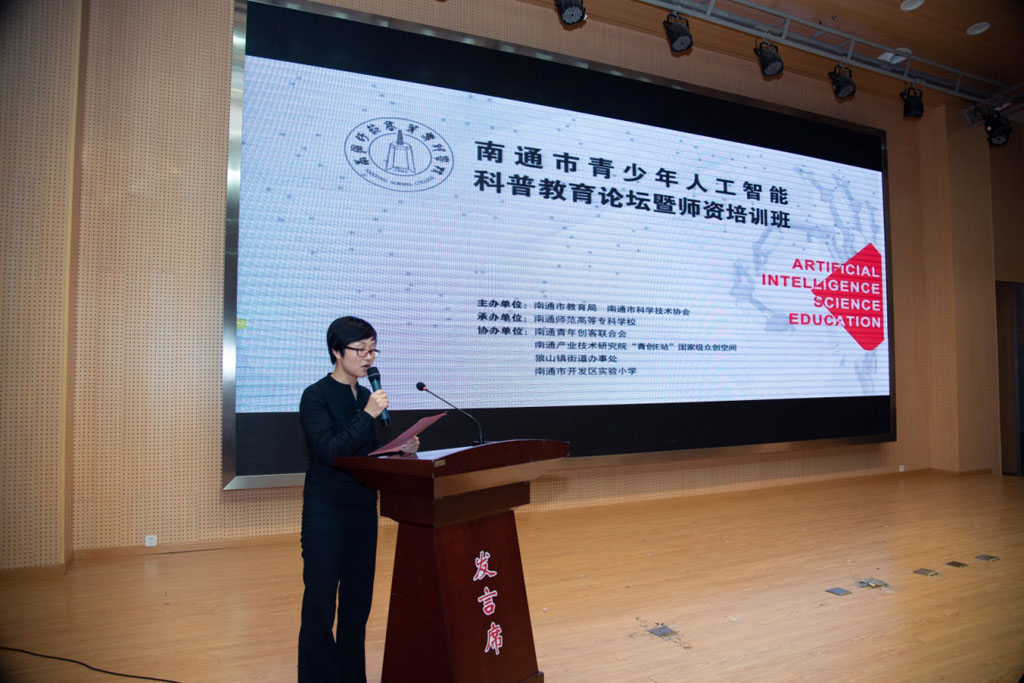 5 月16日下午,南通市青少年人工智能科普教育论坛在我校图文信息中心小报告厅举行。论坛由南通市教育局、南通市科学技术协会联合主办,南通师范高等专科学校承办,教务处具体参与组织工作。此次活动得到了南通青年创客联合会、南通产业技术研究院“青创E站”众创空间、狼山镇街道办事处、南通市开发区实验小学等单位的响应和共同参与协办。论坛由南通青年创客联合会副会长兼秘书长梅梅主持,多位领导和专家出席,全市100多位中小学领导、骨干教师以及我校部分师生参加了会议。