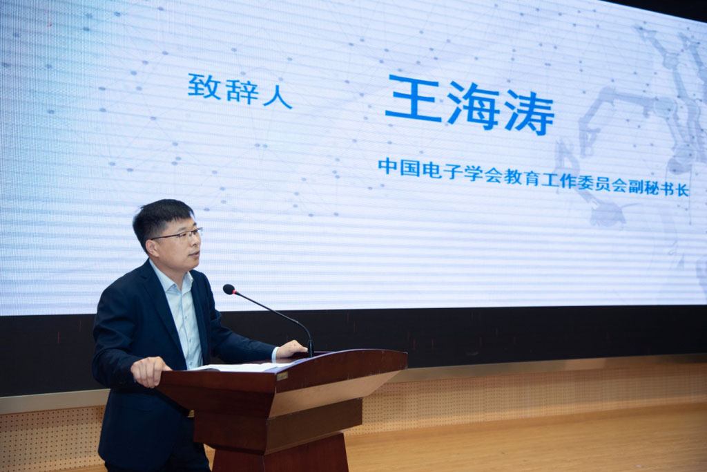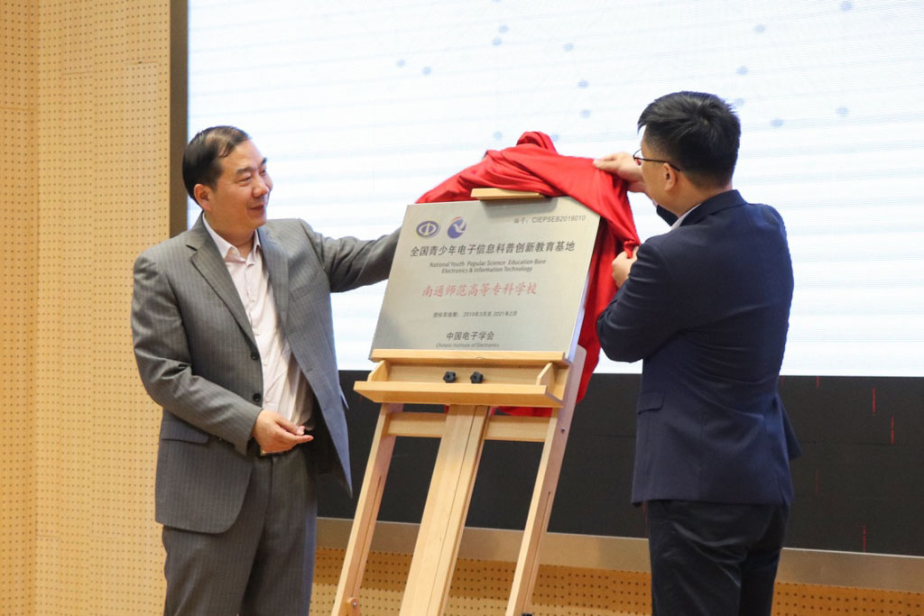 接着由中国电子学会教育工作委员会副秘书长王海涛致辞,我校副校长孙国春与他共同为全国青少年电子信息科普创新教育基地揭牌。