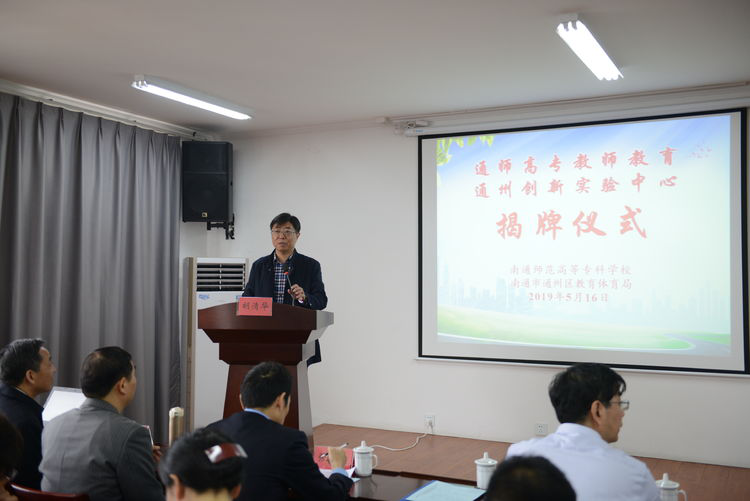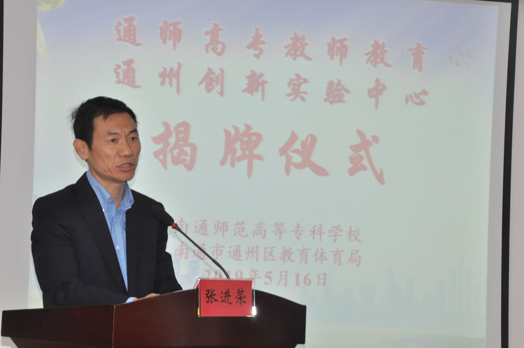 在与会领导、老师和学生代表的共同见证下,通州区教育体育局张进荣局长与南通师范高等专科学校孙国春副校长共同为“教师教育通州创新实验中心”揭牌。