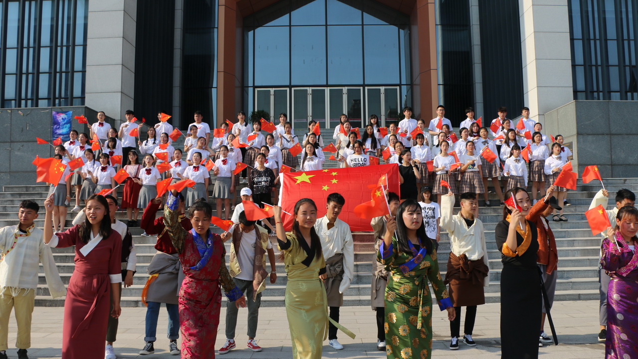藏族生与舞蹈队的同学也按捺不住内心的激动,排成一竖排,抬起头,挺起胸,亮出他们自信的脸庞,在欢快的旋律声中跳起了活泼的藏舞,舞姿摇曳,并默契十足的在古筝间穿梭,呈现出一派民族融合,和谐美好的景象。