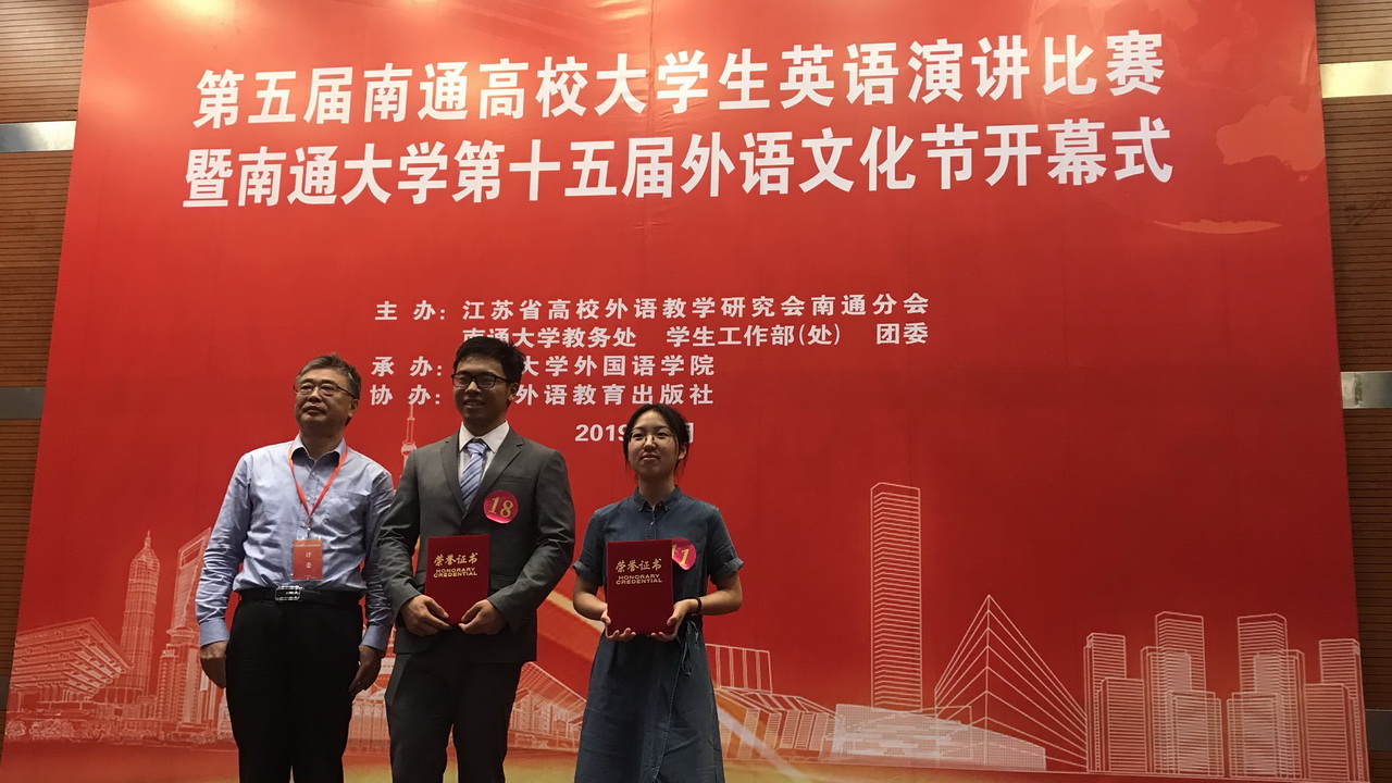 2019年5月29日下午,第五届南通高校大学生英语演讲比赛在南通大学隆重举行。本次比赛共有22名来自南通十多所高校 的选手参加了不分年级、不分专业的角逐。经过两轮激烈的比拼,我院选手再一次获得特等奖第一名。本次比赛小教15理科班仲蕴玮同学获特等奖第一名;小教18班石雨同学初试牛刀,荣获三等奖,可喜可贺。英语教育系周尧老师被评为优秀指导老师。我校已连续五年在该赛事中取得出色战绩!