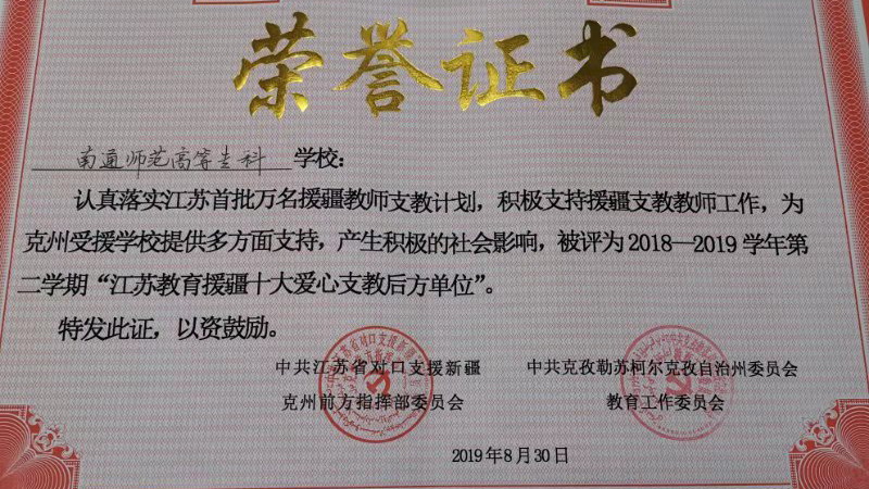 2018年8月侯志东、许海燕老师积极响应教育部“万名教师援藏援疆”计划,成为江苏省首批赴新疆南疆克州(克孜勒苏柯尔克孜自治州)职业技术学校支教教师。作为南通援疆团领队侯志东被江苏援克前指和州教育局任命为克州职业技术学校副校长、州直(南通、连云港和盐城)援疆教师自管会主任。