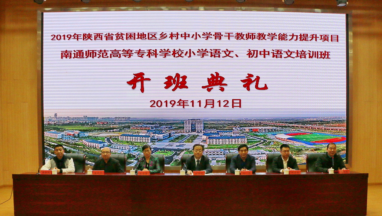 受陕西省教育厅委托,2019年陕西省贫困地区乡村中小学骨干教师教学能力提升项目南通师范高等专科学校小学初中语文培训班开班典礼于11月12日在我校图文信息楼一楼小报告厅隆重举行。陕西省教育厅副厅长王海波、职成教处处长何玉麒、教师处副处长朱晓冬,南通师范高等专科学校党委书记刘锋、校长朱月萍、副校长孙国春、继教处处长徐汝成出席开班典礼,开班仪式由孙国春副校长主持。来自陕西省的50位小学、50位初中语文乡村骨干教师将在这里进行为期20天的培训。