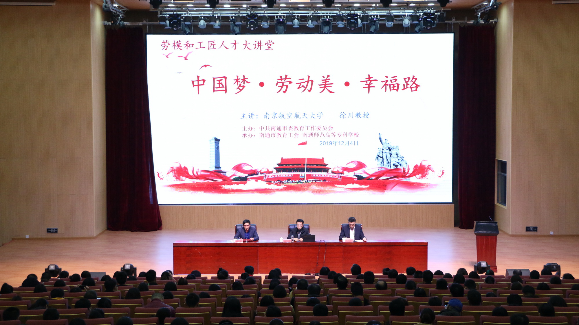 12日4日下午,深秋的江海之滨,依然飘洒着浓浓的暖意,由中共南通市委教育工委组织,南通市教育工会和我校承办的“中国梦.劳动美.幸福路”劳模与工匠人才大讲堂在学校图文信息中心大报告厅举行。活动邀请南京航空航天大学徐川教授作了“聚焦铸魂育人,彰显思想伟力”——做一名让学生终生难忘陪伴者的精彩讲座。