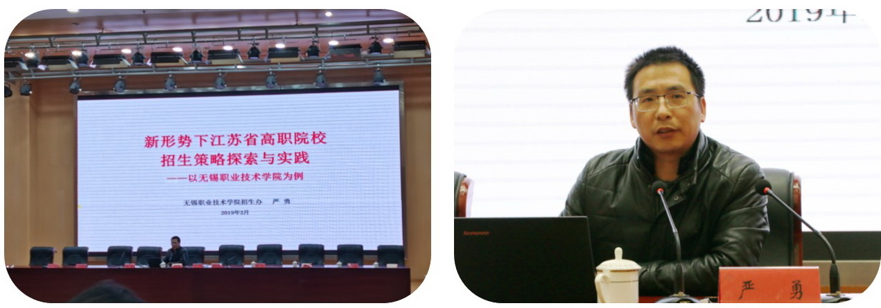 会议还专门邀请了无锡职业技术学院招生办严勇主任作专题报告。严主任以《新形势下江苏省高职院校招生策略探索与实践——以无锡职业技术学院为例》为题,从江苏省高考招生制度要点、无锡职院招生情况说明、无锡职院招生方案说明、无锡市容市情四个方面介绍,为学校更好的谋划招生工作提供了参考。