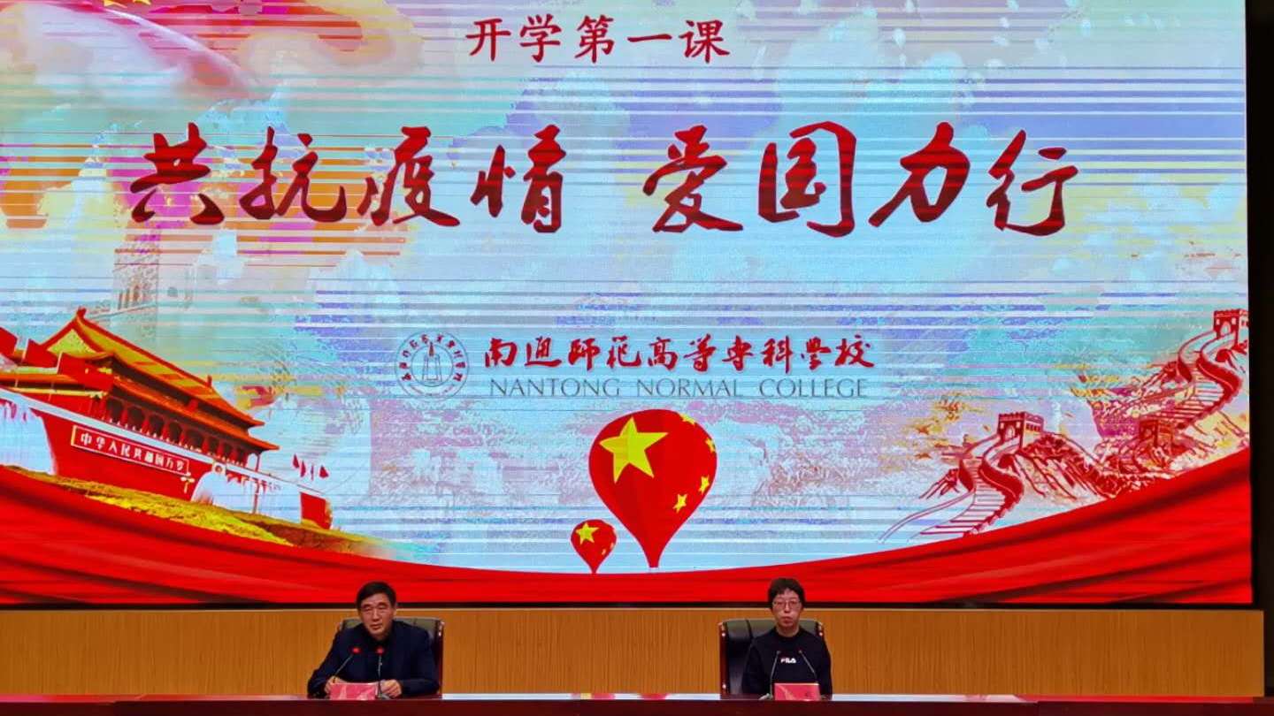 为切实做好高校思想政治工作,充分用好疫情防控人民战争、总体战、阻击战形成的宝贵教育资源,大力宣传全国人民在以习近平同志为核心的党中央坚强领导下,众志成城战疫情的生动实践,宣传党的领导优势和社会主义制度优势,引导广大师生不断增强“四个意识”、坚定“四个自信”、做到“两个维护”,根据市委教育工作领导小组的统一安排,4月22日,南通师范高等专科学校开展党委书记、“战疫”英雄同上 “共抗疫情,爱国力行”的开学第一课活动。